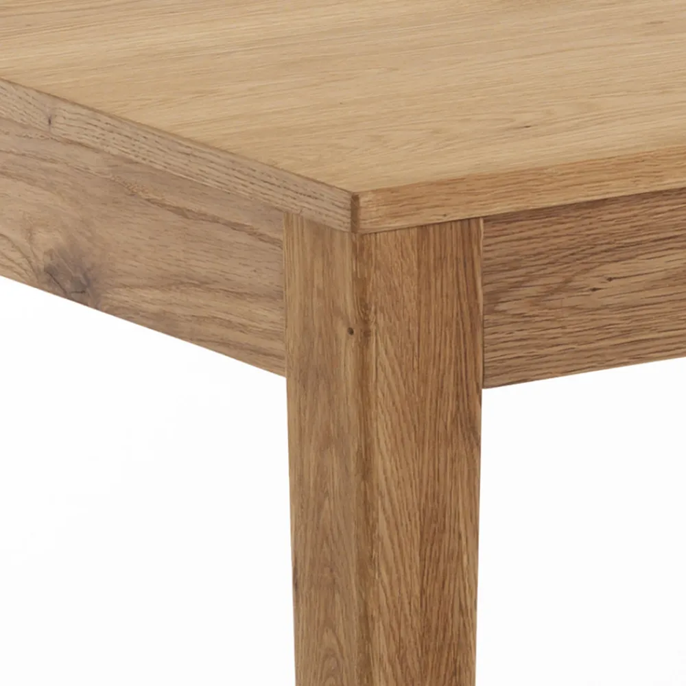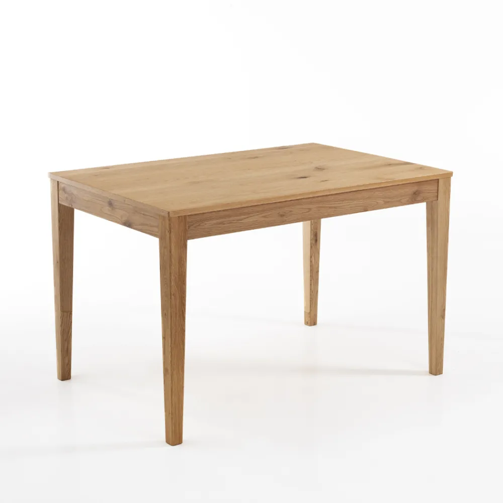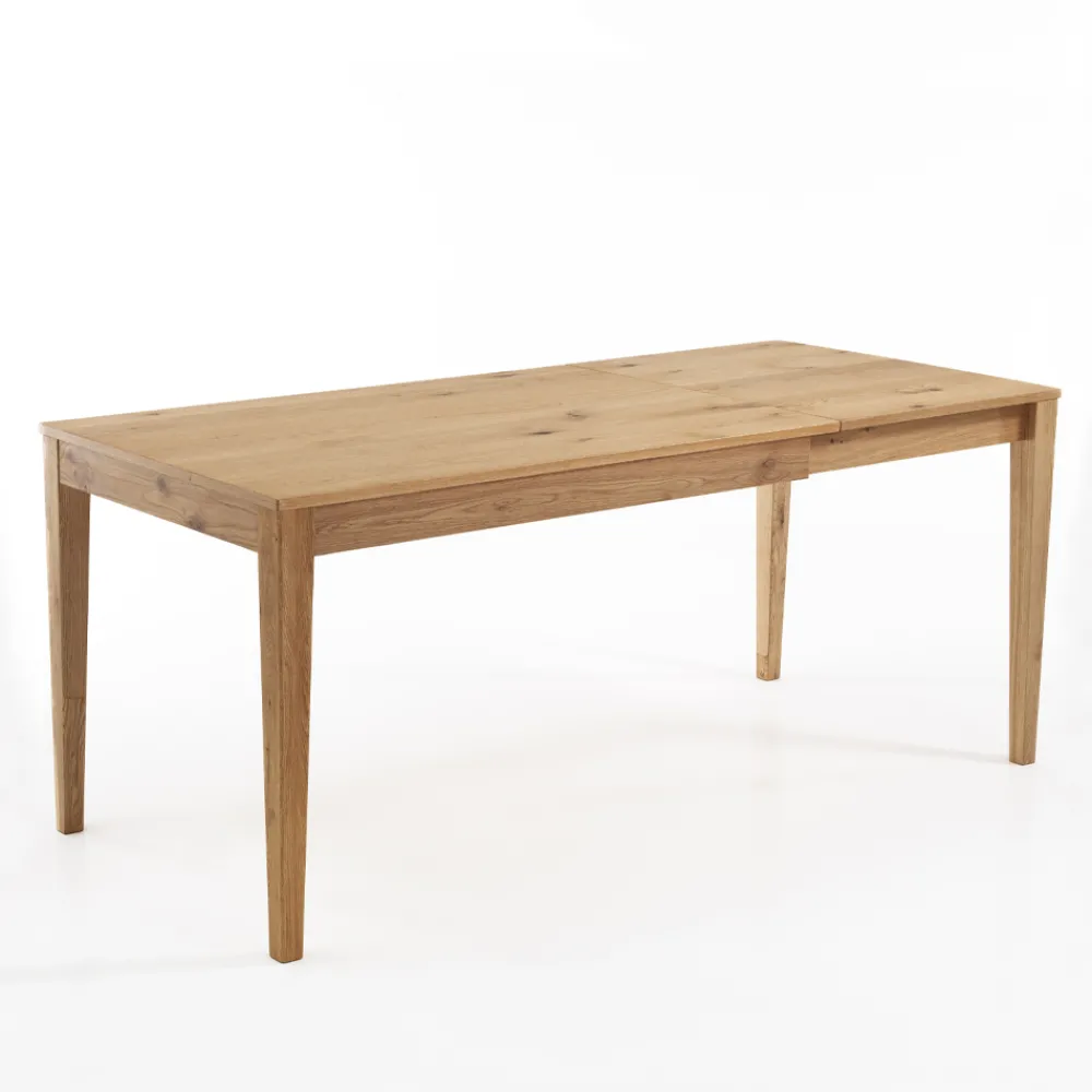 Ausziehbarer Tisch für den Innenbereich mit Platte aus massivem Birkenholz mit Eichenfurnier, Stärke 2 cm , Untergestell aus massivem Eichenholz gebeizt und Verlängerung vollständig unter der Tischplatte positioniert .