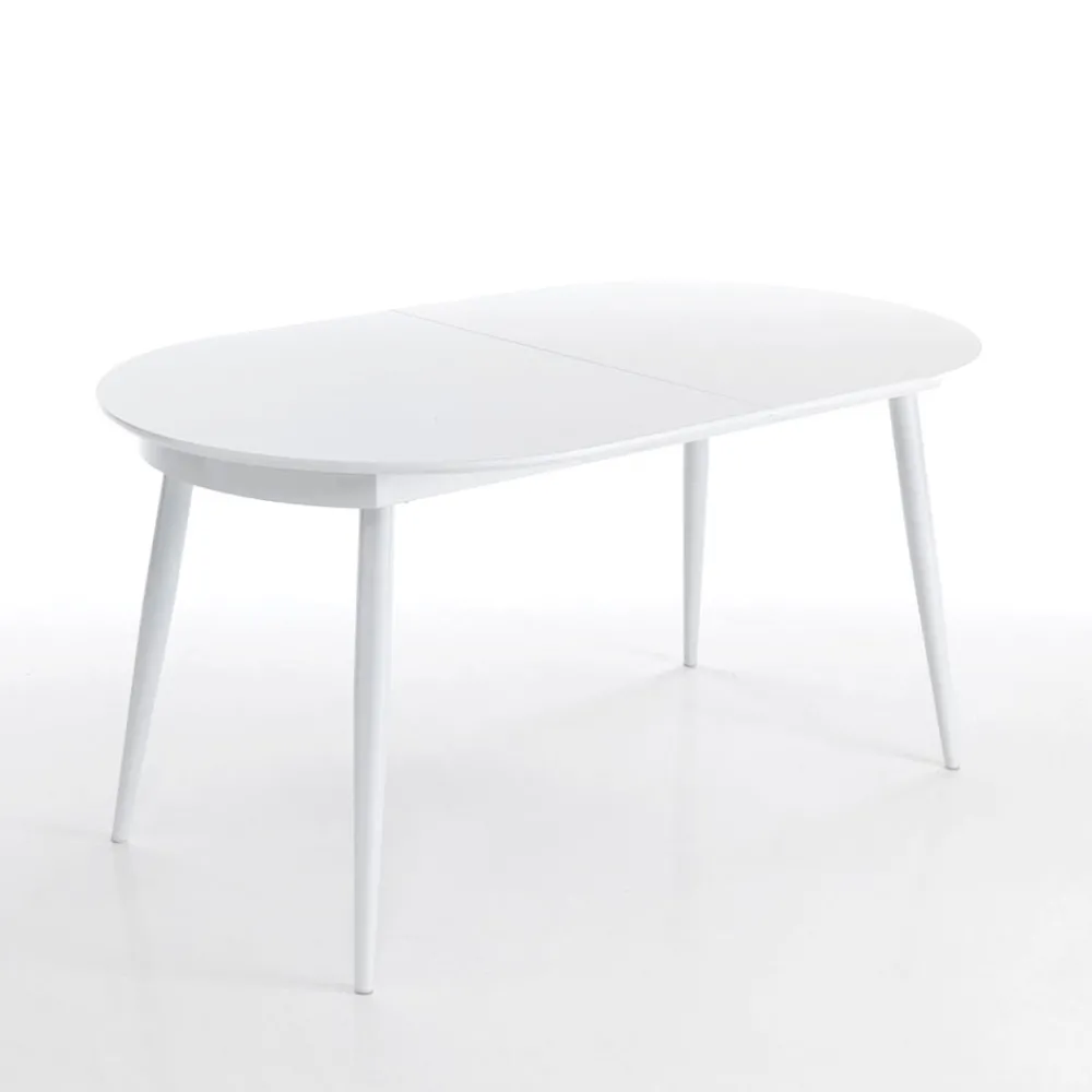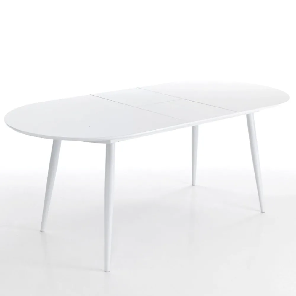 Tisch für den Innenbereich mit Platte aus glänzend weiß lackiertem MDF . 2 cm, Sockel aus glänzend weiß lackiertem Metall und zentrale Verlängerung unter der Platte , komplett .