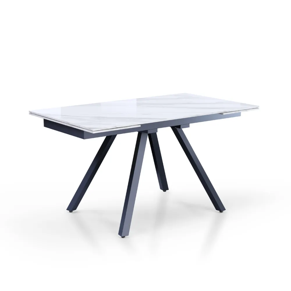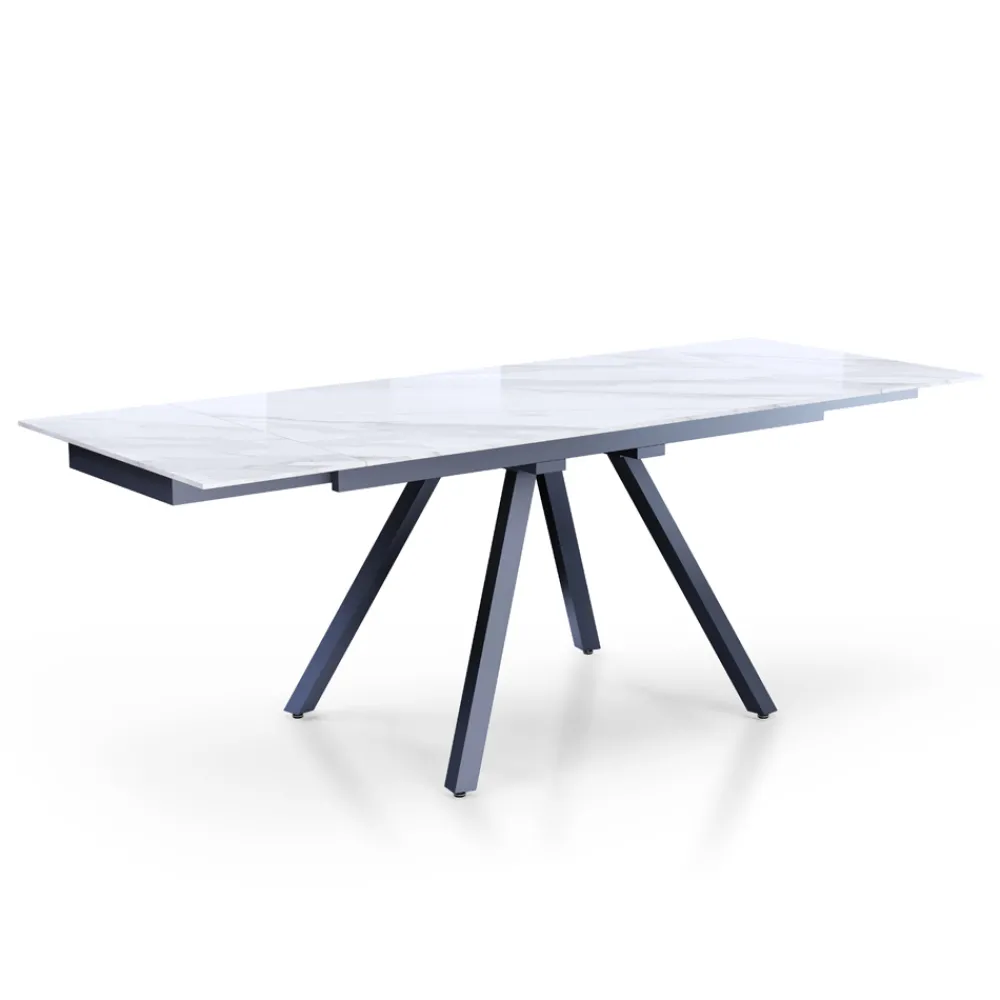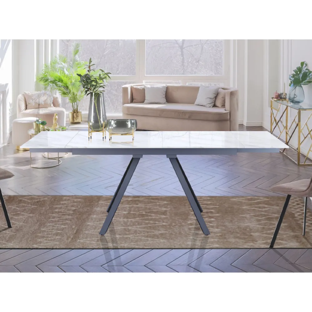 Tisch für den Innenbereich mit Platte aus 10 mm starker Keramik mit glänzend weißem Marmorfinish , Untergestell aus mattgrau lackiertem Stahl und vollständig unter der Tischplatte positionierten Verlängerungen .