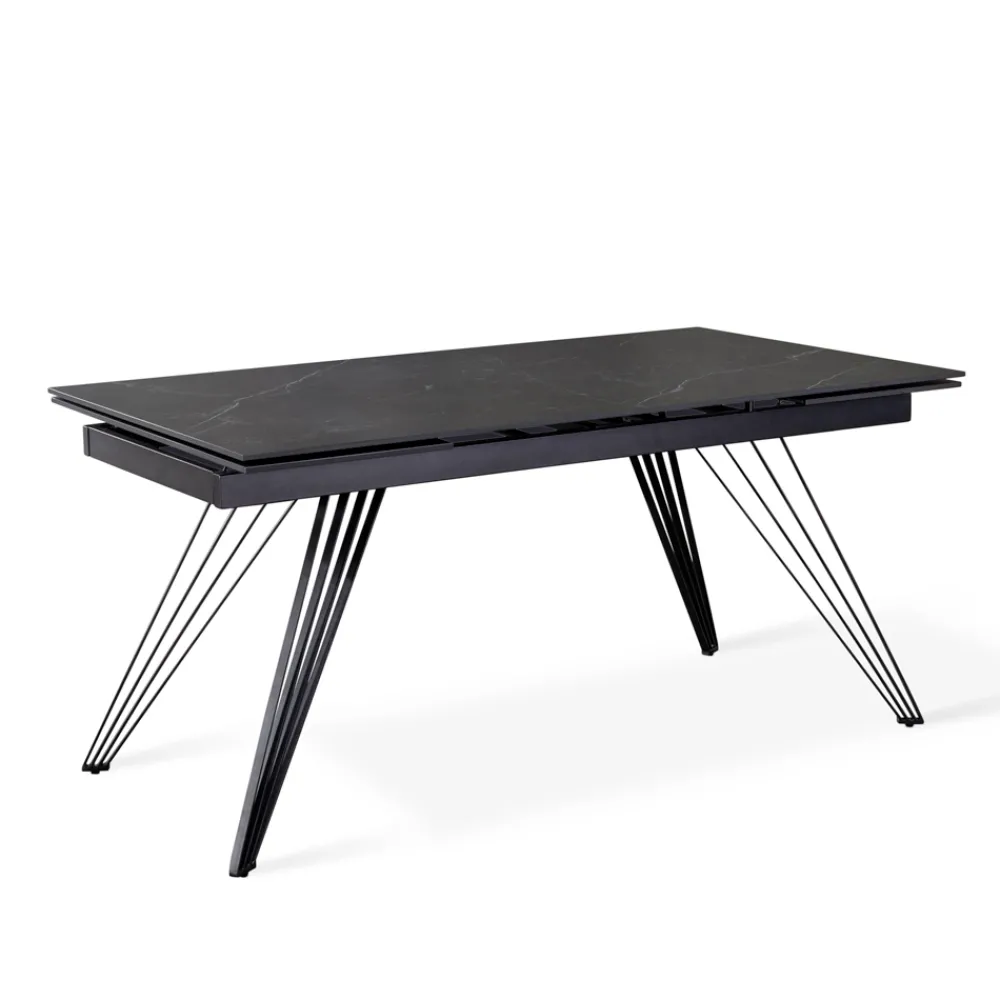 Ausziehbarer Wohnzimmertisch mit mattschwarzer Metallstruktur und Keramikplatte mit Marmoreffekt , matte Oberfläche.
