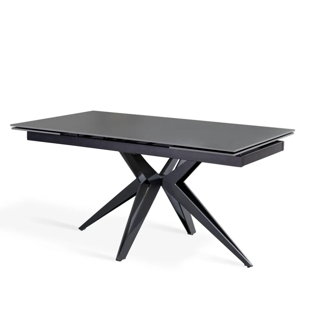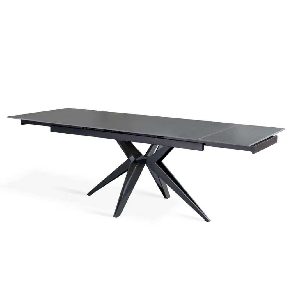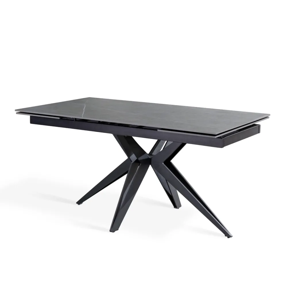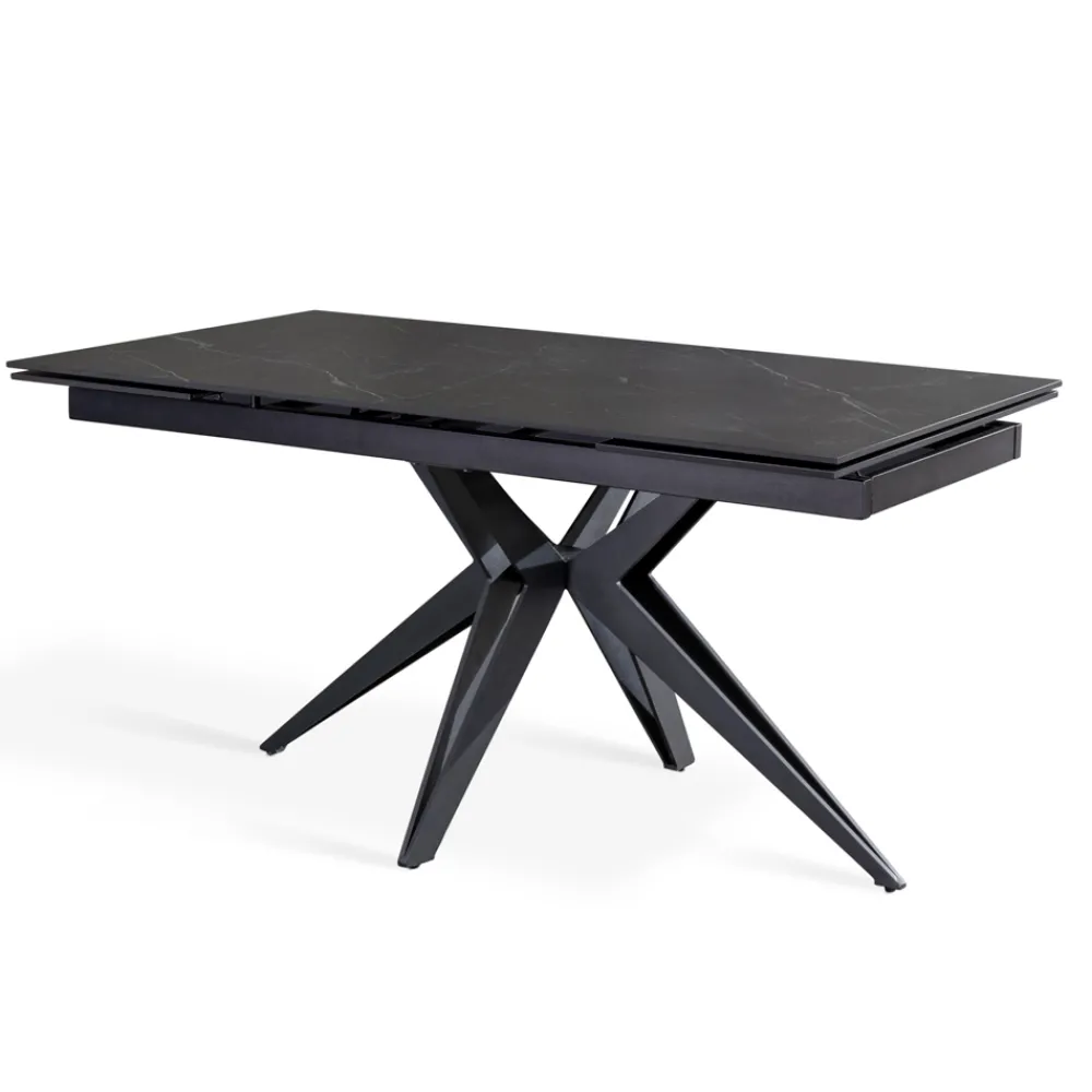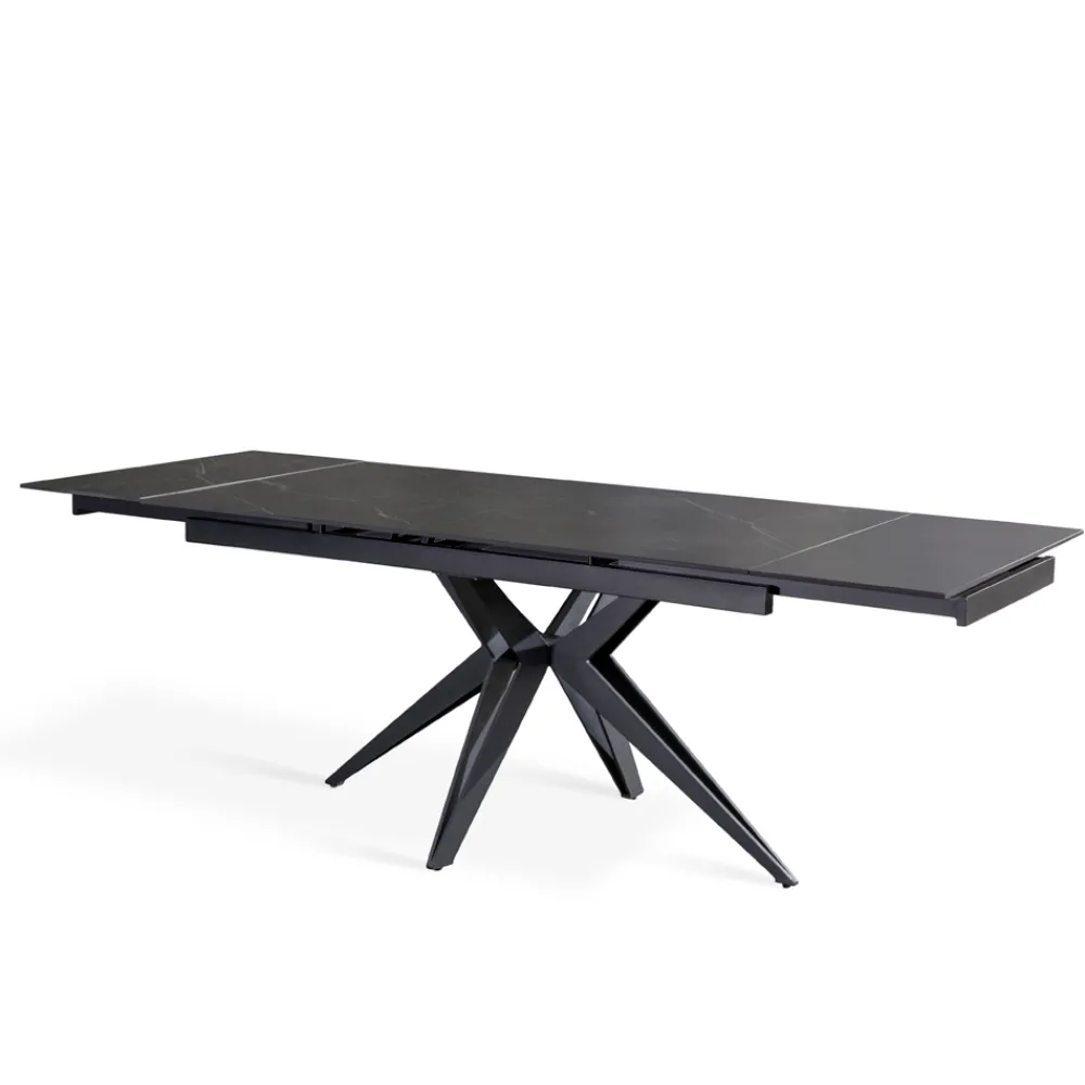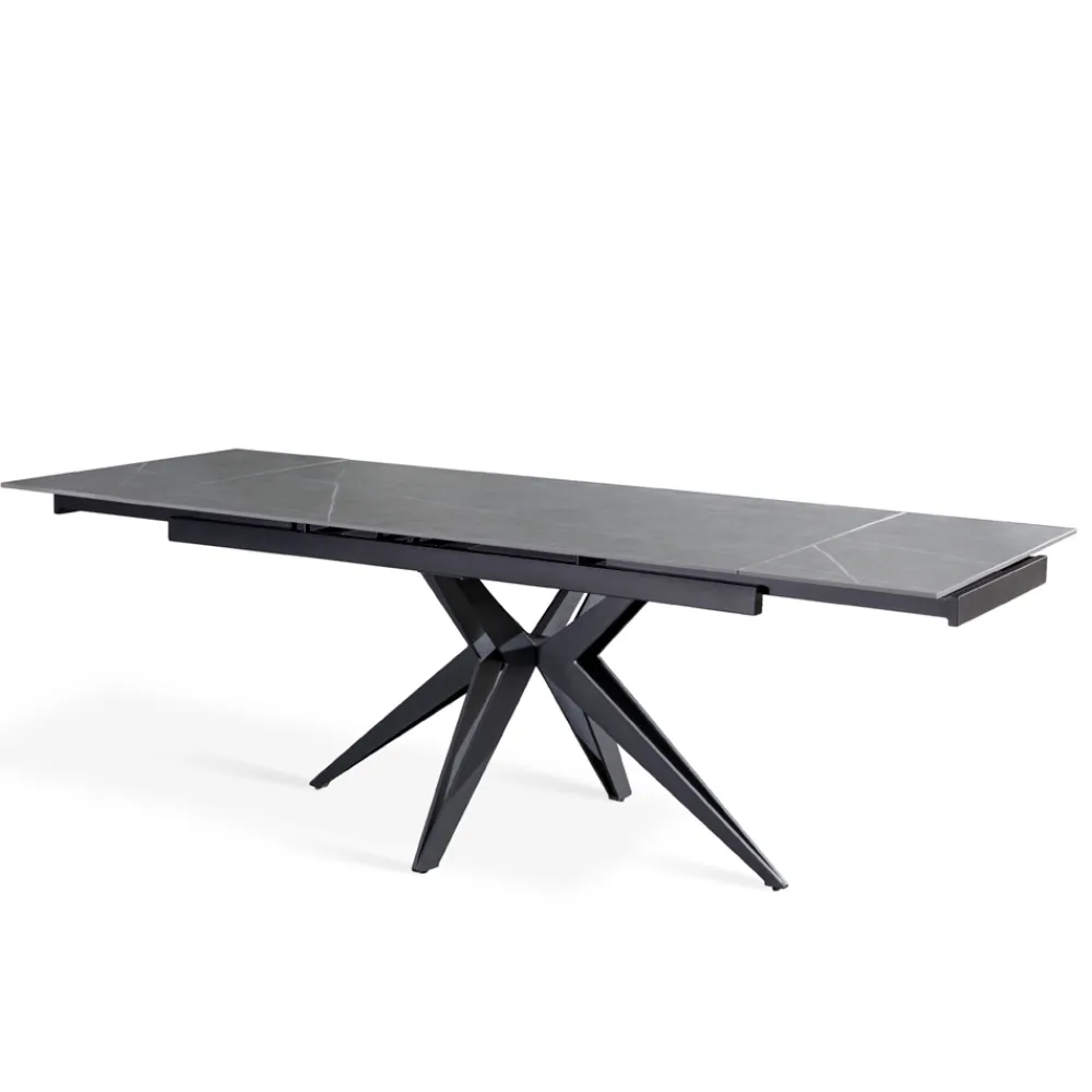 Ausziehbarer Wohnzimmertisch mit Keramikplatte , Sternbeinen aus Metall und ausziehbaren Keramikverlängerungen.