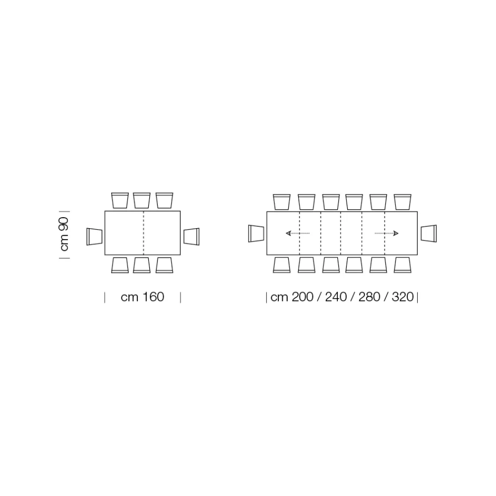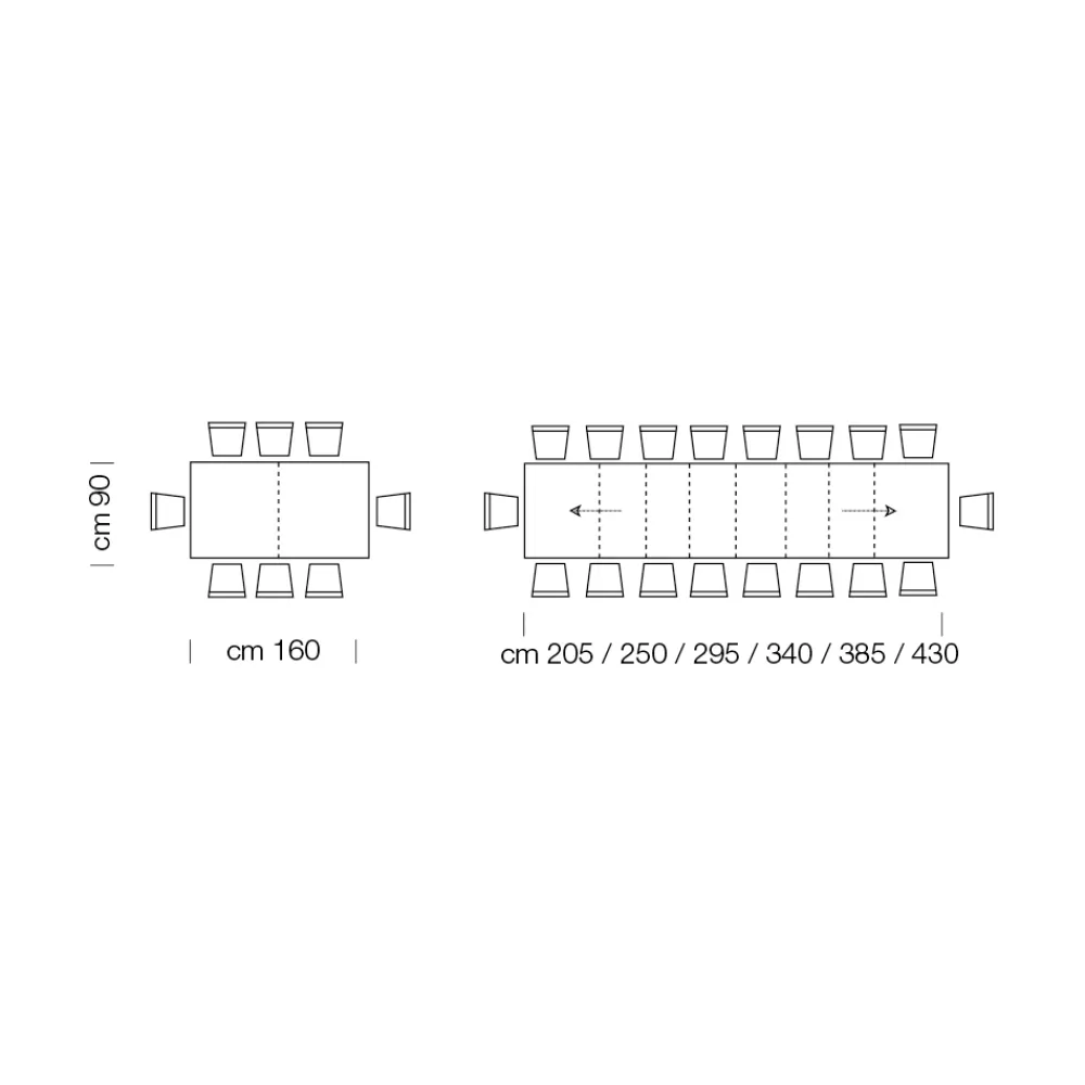 - L 160 (430) x T 90 x H 77 cm. 18-Sitzer, erweiterbar mit sechs 45-cm-Verlängerungen, drei interne und drei in einer wiederverwendbaren Pappschachtel geliefert;