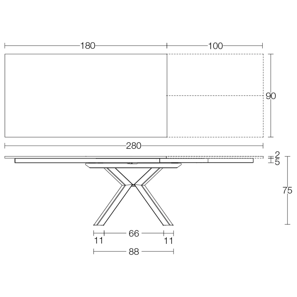 - Länge: 180/280 cm x Tiefe: 90 cm x Höhe: 75 cm – 100 cm Verlängerung
