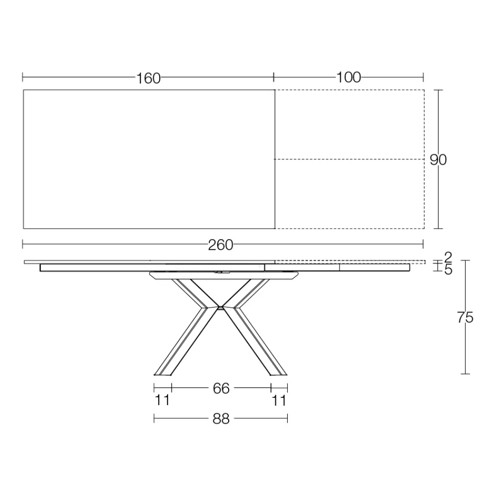 - Länge: 160/260 cm x Tiefe: 90 cm x Höhe: 75 cm – 100 cm Verlängerung