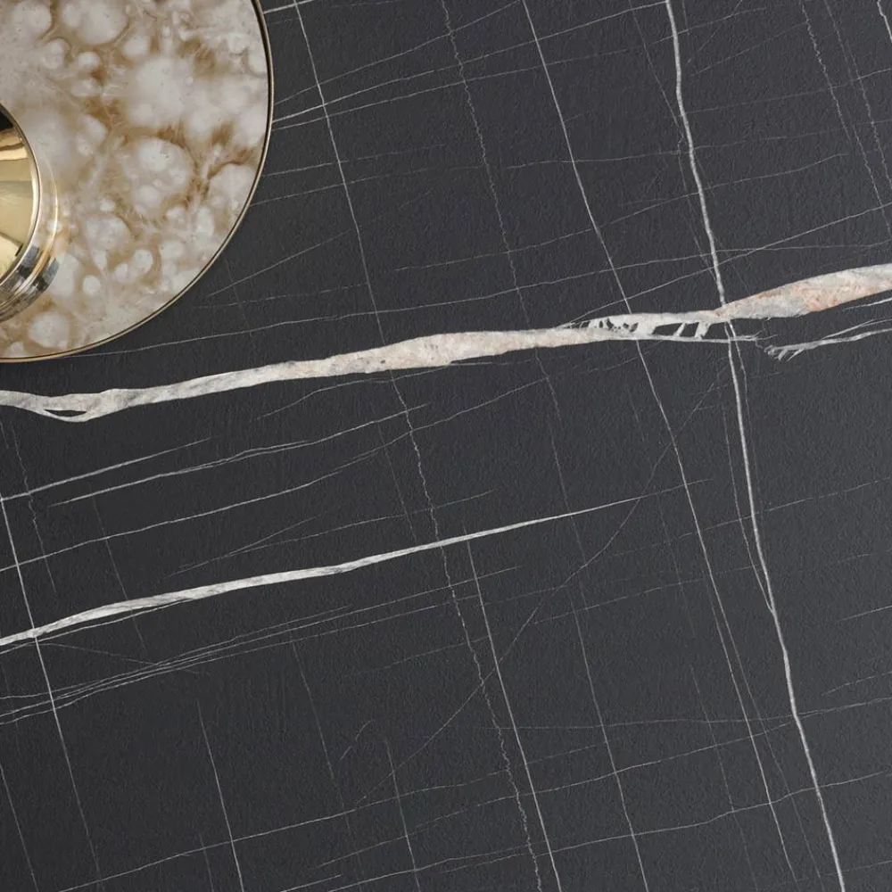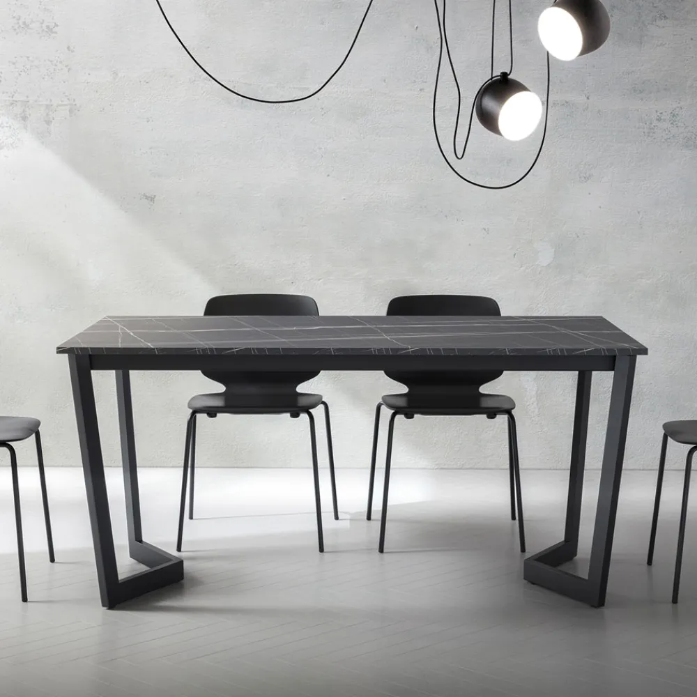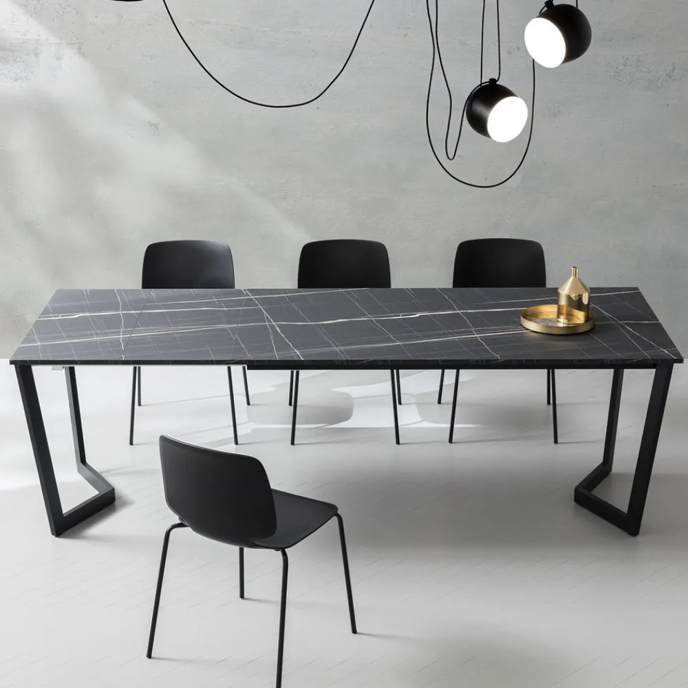 Ausziehbarer Esstisch mit Struktur aus Metall mit Epoxidpulverbeschichtung in Schwarz, HPL-Platte in verschiedenen Ausführungen und in zwei verschiedenen Größen erhältlich, hergestellt in Italien . Seine Ästhetik konzentriert sich ganz auf einen funktionalen und modernen Stil , grundlegende Merkmale für die Schaffung einer exklusiven Harmonie im Raum.