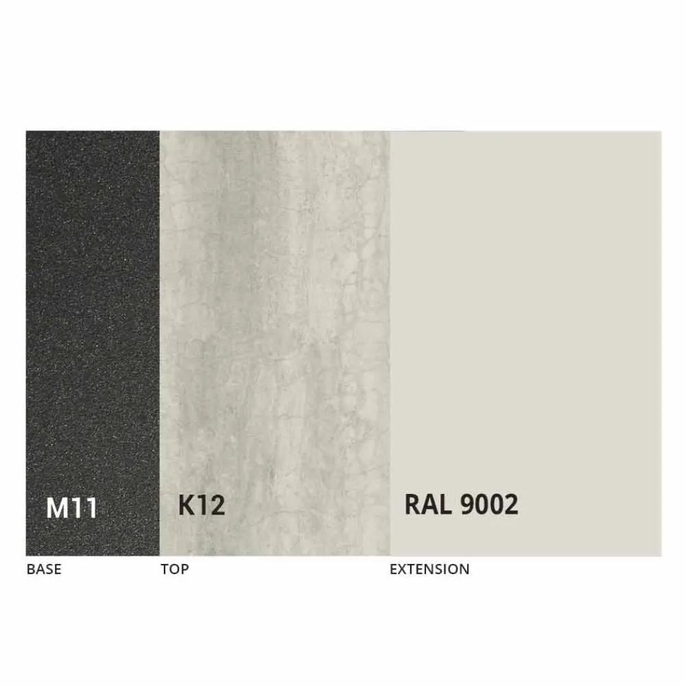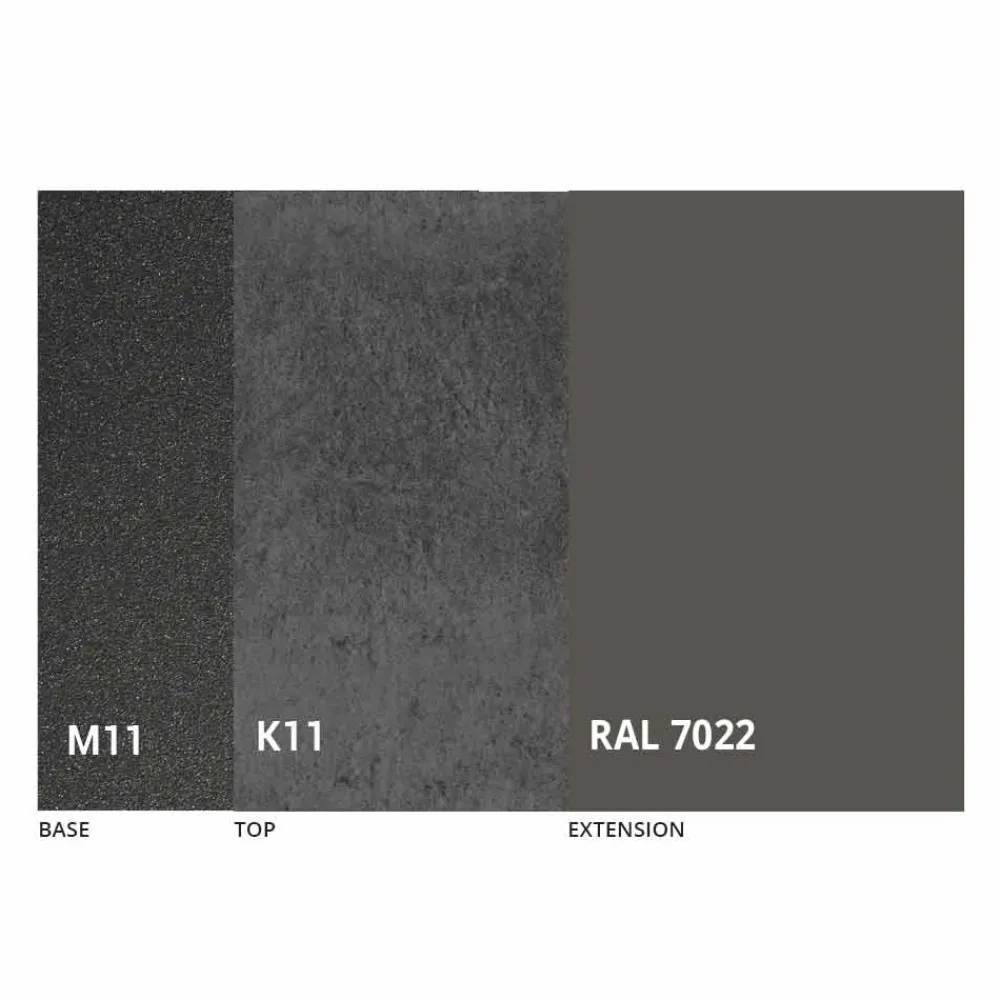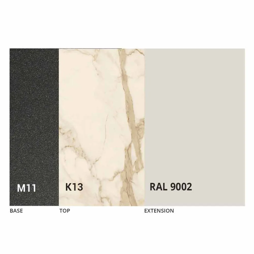 Dieser rechteckige , ausziehbare Esstisch verfügt über eine dünne Laminam-Keramikplatte , die mit einer Platte mit schrägen Kanten und einem Sockel aus geprägtem, graphitfarbenem Metall gekoppelt ist.