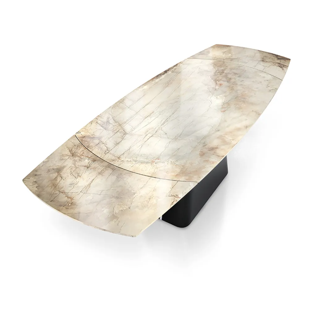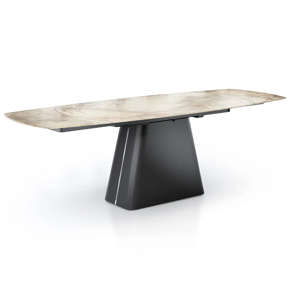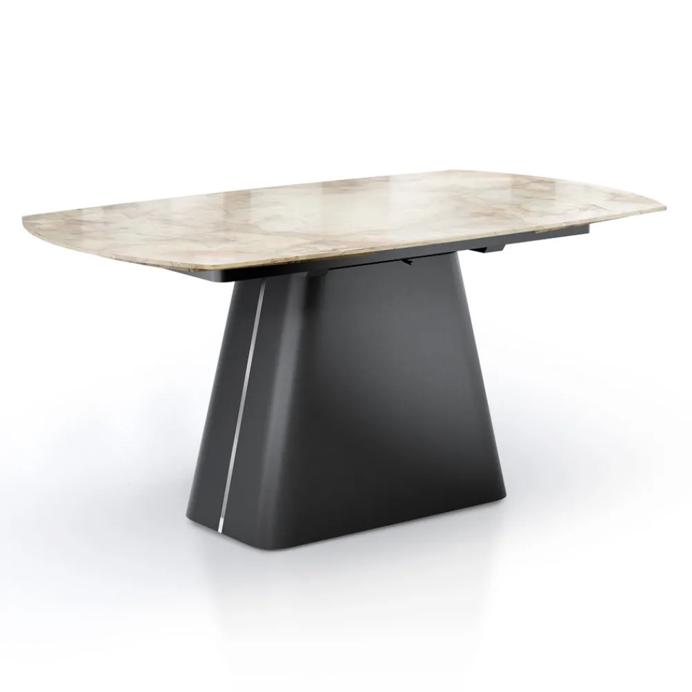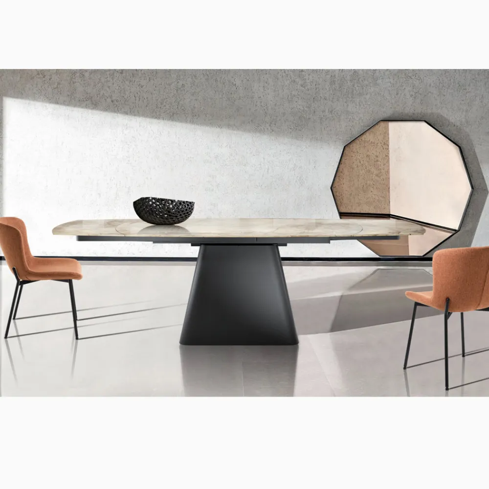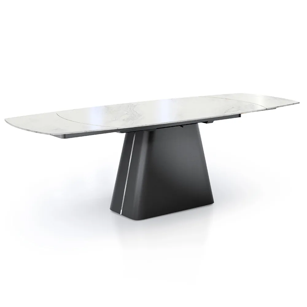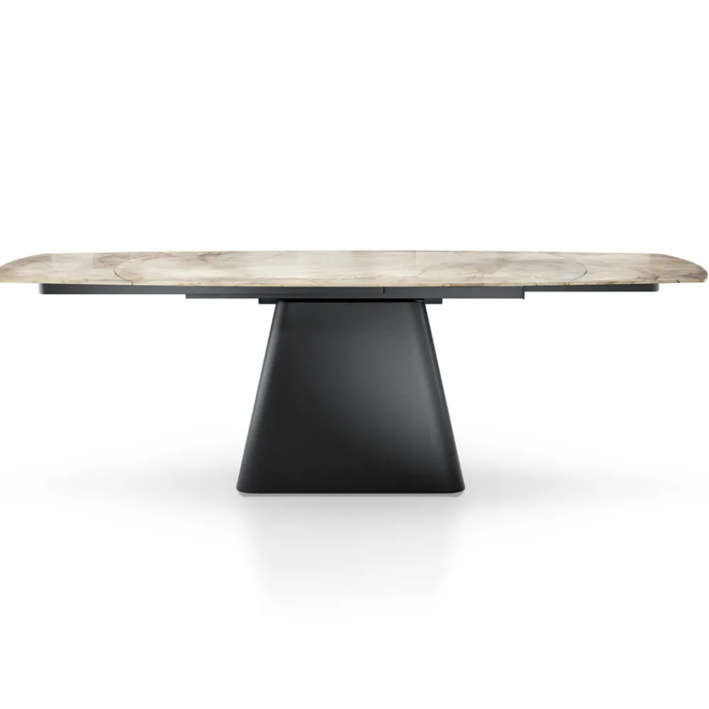 Dieser ausziehbare Tisch ist ein Meisterwerk aus Design und Funktionalität, ideal für alle, die Eleganz und Vielseitigkeit in einem einzigen Möbelstück vereinen möchten. Die Oberfläche sitzt auf einem stabilen und stilistisch auffälligen schwarzen Metallsockel und bietet einen atemberaubenden optischen Kontrast, der in jedem Esszimmer ein Blickfang ist.