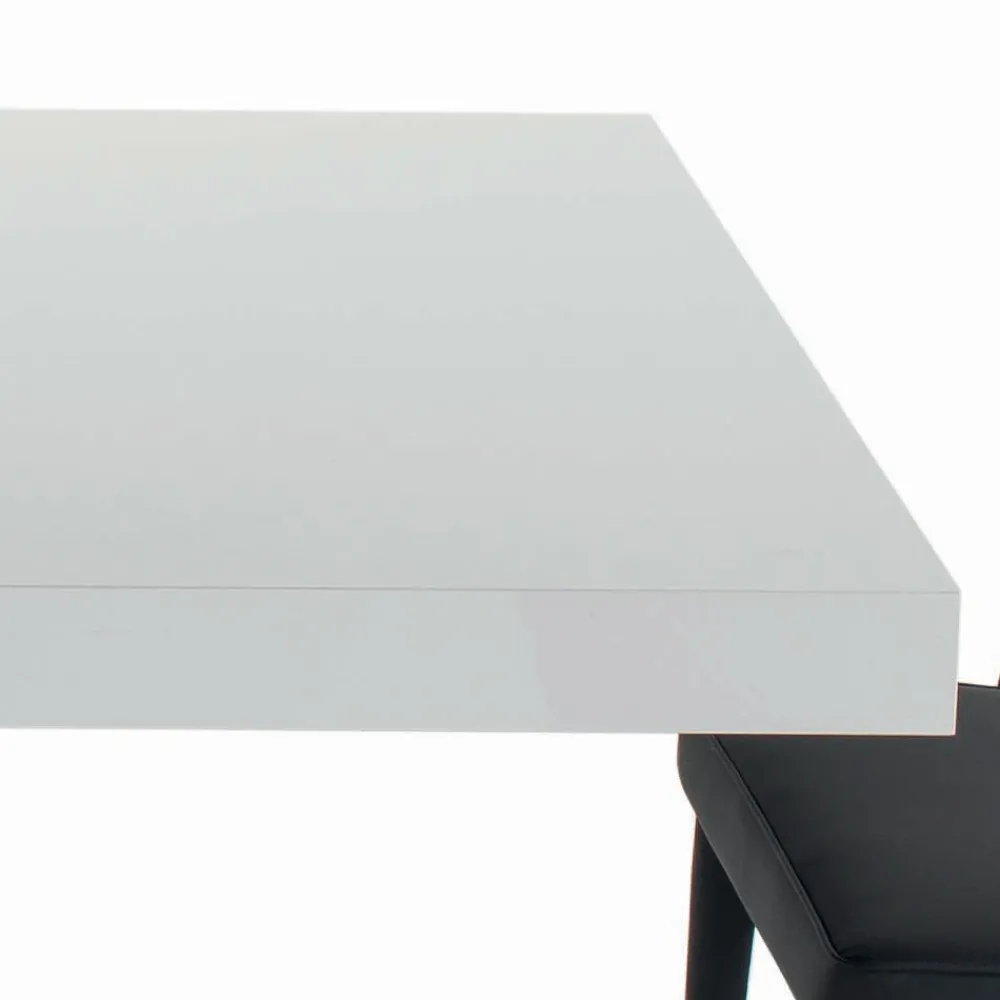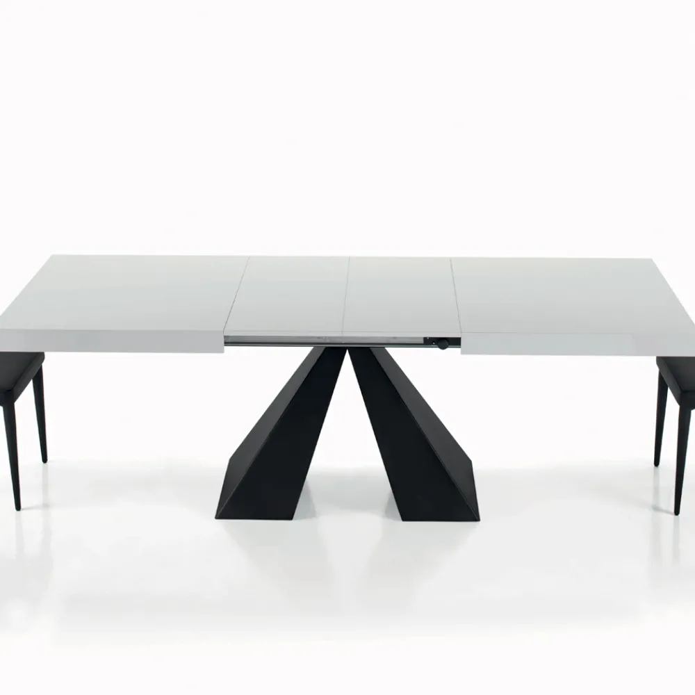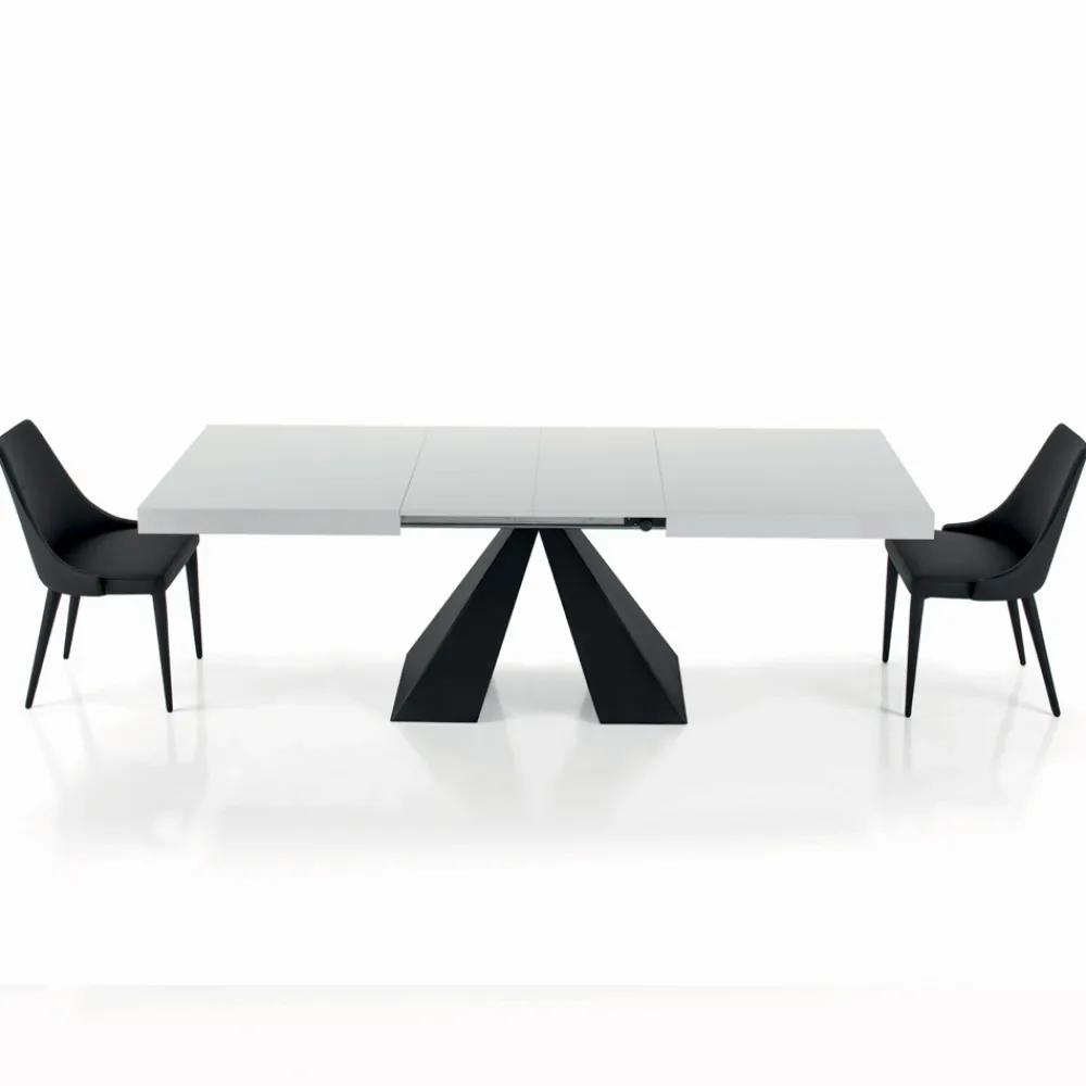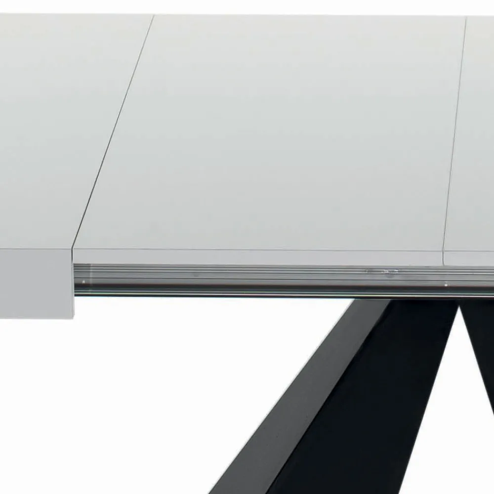 Ausziehbarer Wohnzimmertisch mit synchronisierter zentraler Öffnung (interne Erweiterungen), Laminatplatte in mattweißem Finish , klappbarer Kante, schwarz lackiertem Stahlgestell und verstellbaren Füßen.
