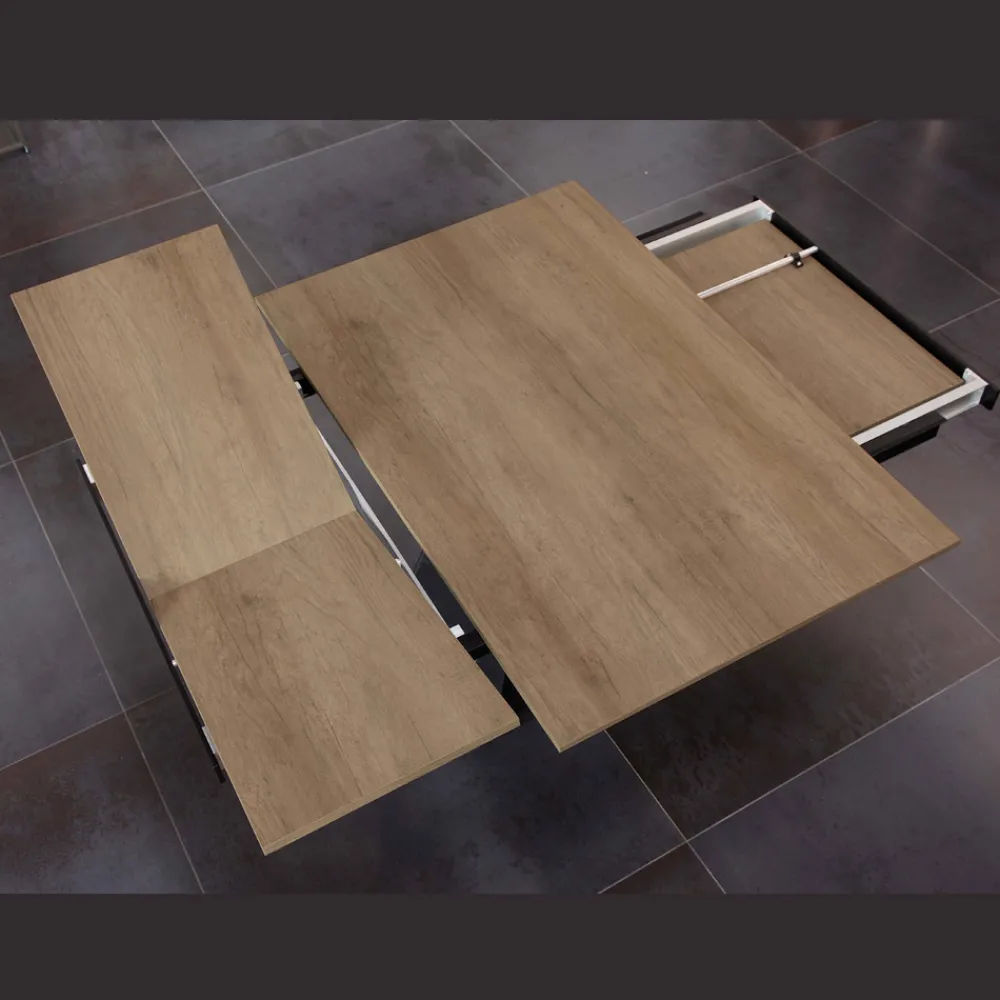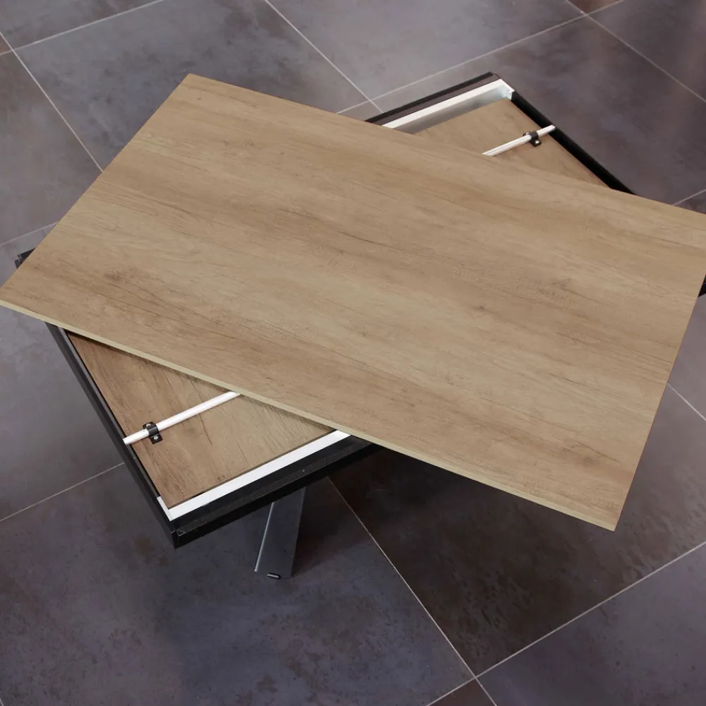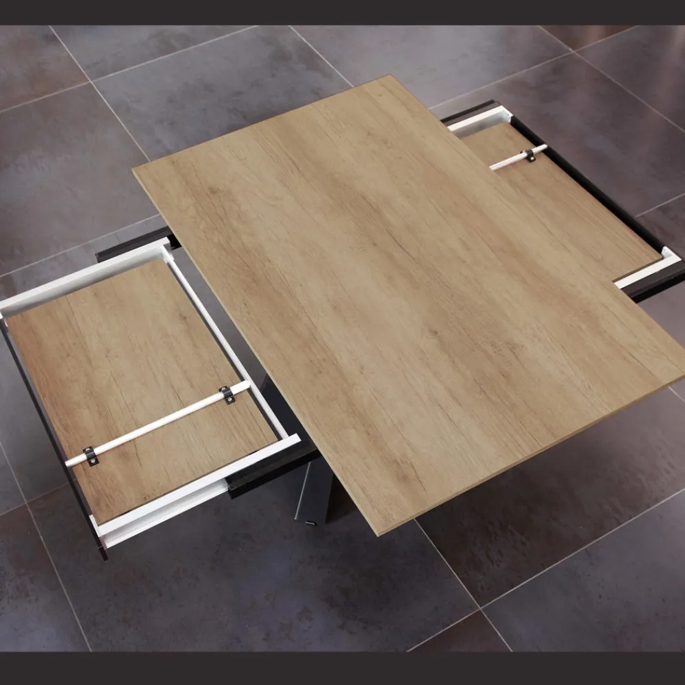 Esstisch mit Melaminplatte, schwarz lackiertem Metallgestell mit Führungen und Strukturrahmen komplett aus Aluminium.