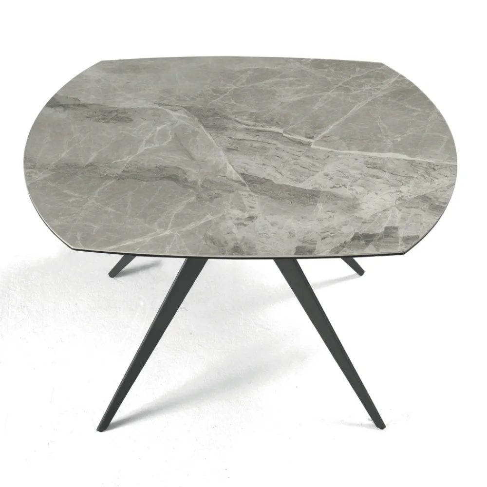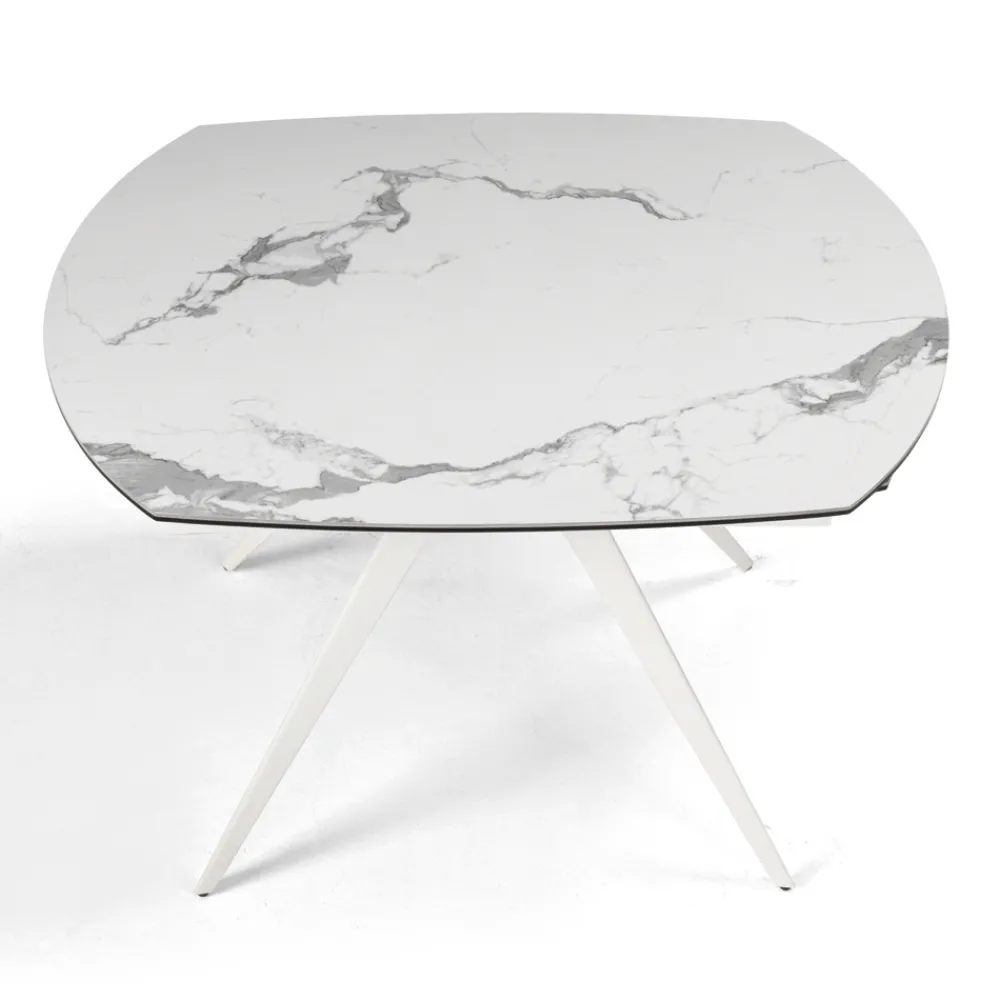 Bis zu 180 cm ausziehbarer Esstisch aus Feinsteinzeug mit Marmoroptik.