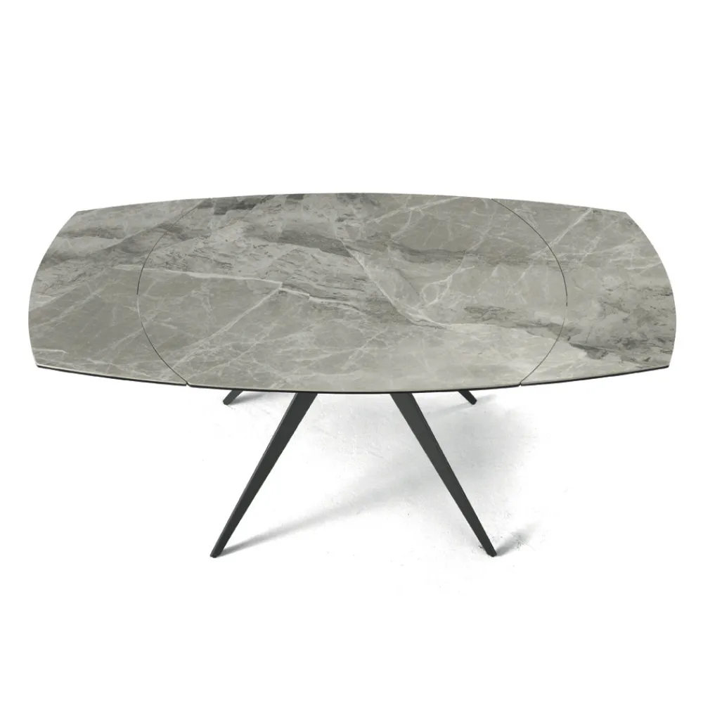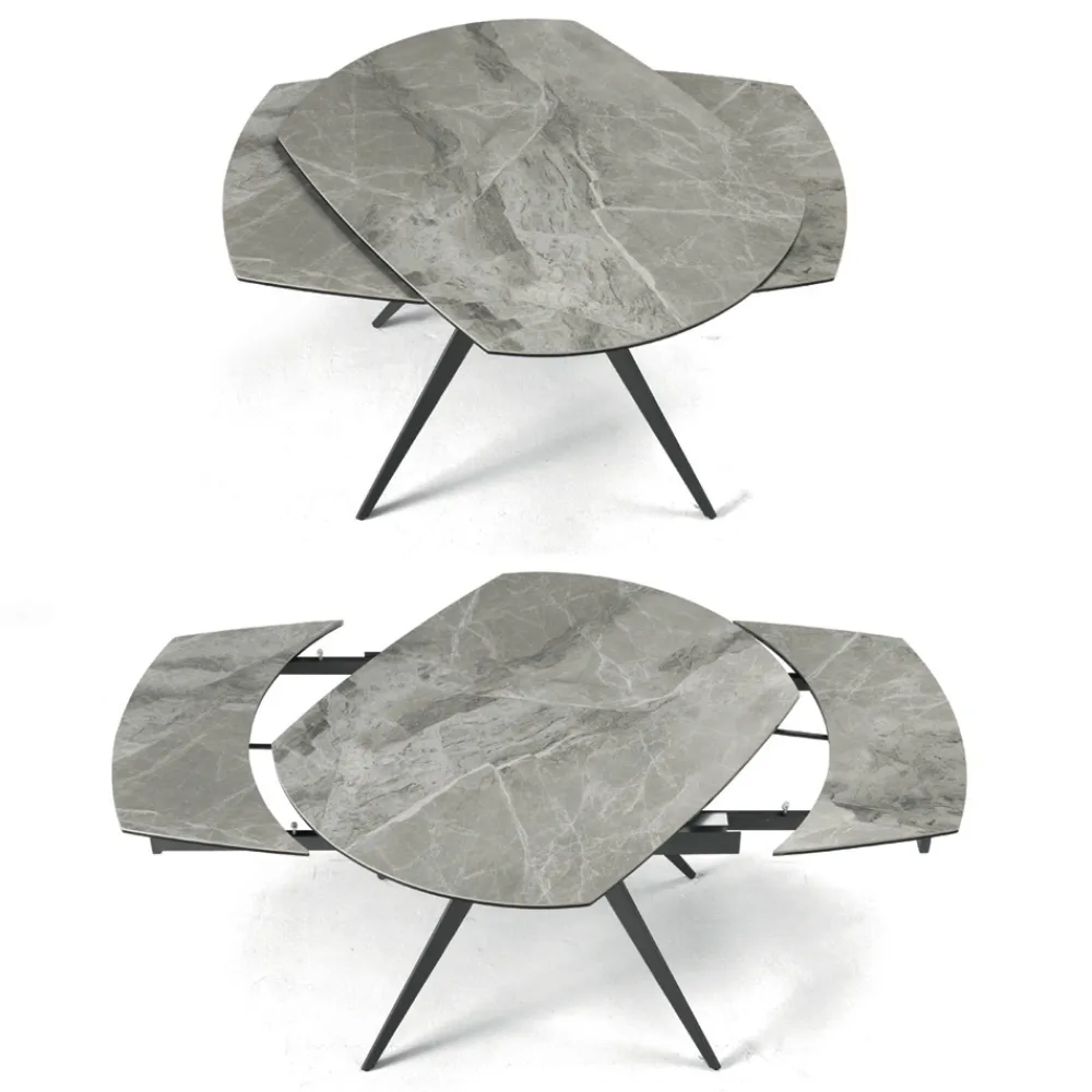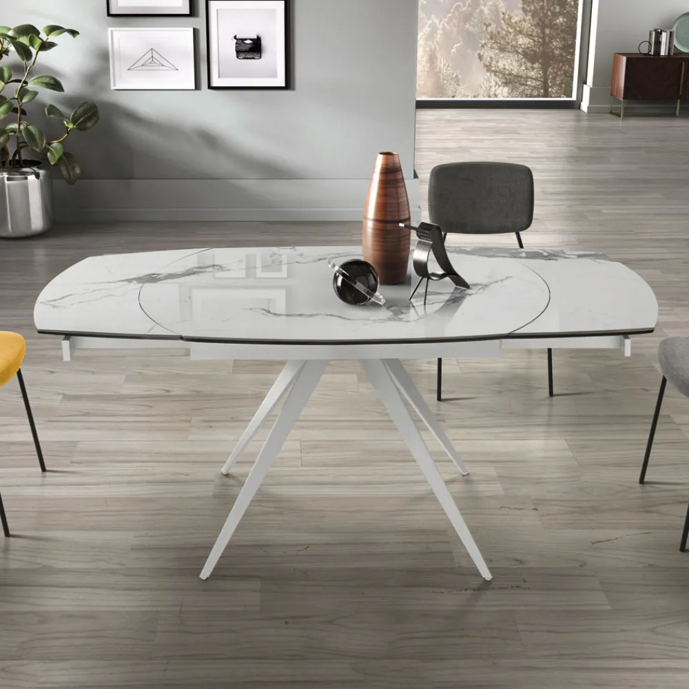 Esstisch mit Platte aus Feinsteinzeug in Marmoroptik und Sockel aus lackiertem Metall in modernem und elegantem Stil. Der Drehmechanismus und die seitlichen Verlängerungen von 30 cm machen es für diejenigen geeignet, die gerne Mittag- oder Abendessen in Gesellschaft von Freunden oder der Familie organisieren. Das Ergebnis ist ein imposanter, solider und funktionaler Esstisch, der durch seinen zeitgenössischen Stil und seine einzigartige und raffinierte Persönlichkeit die Rolle des Protagonisten im Raum erobern kann.
