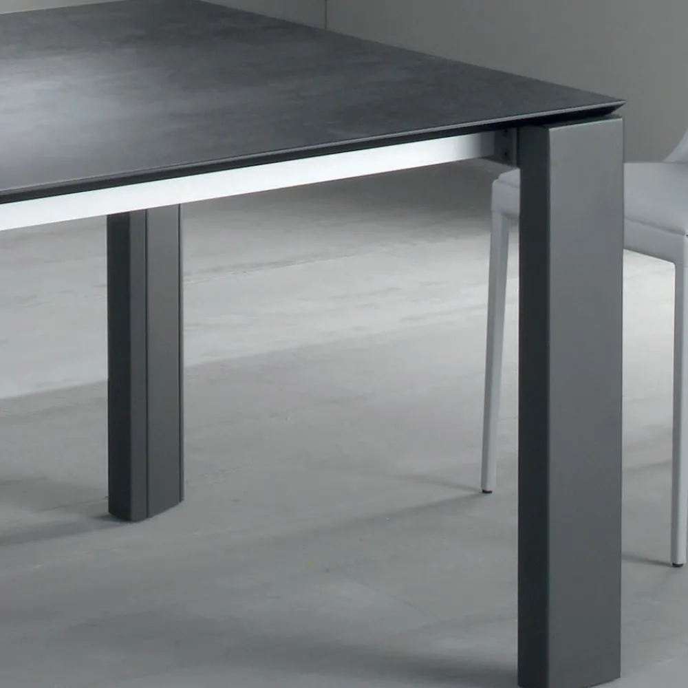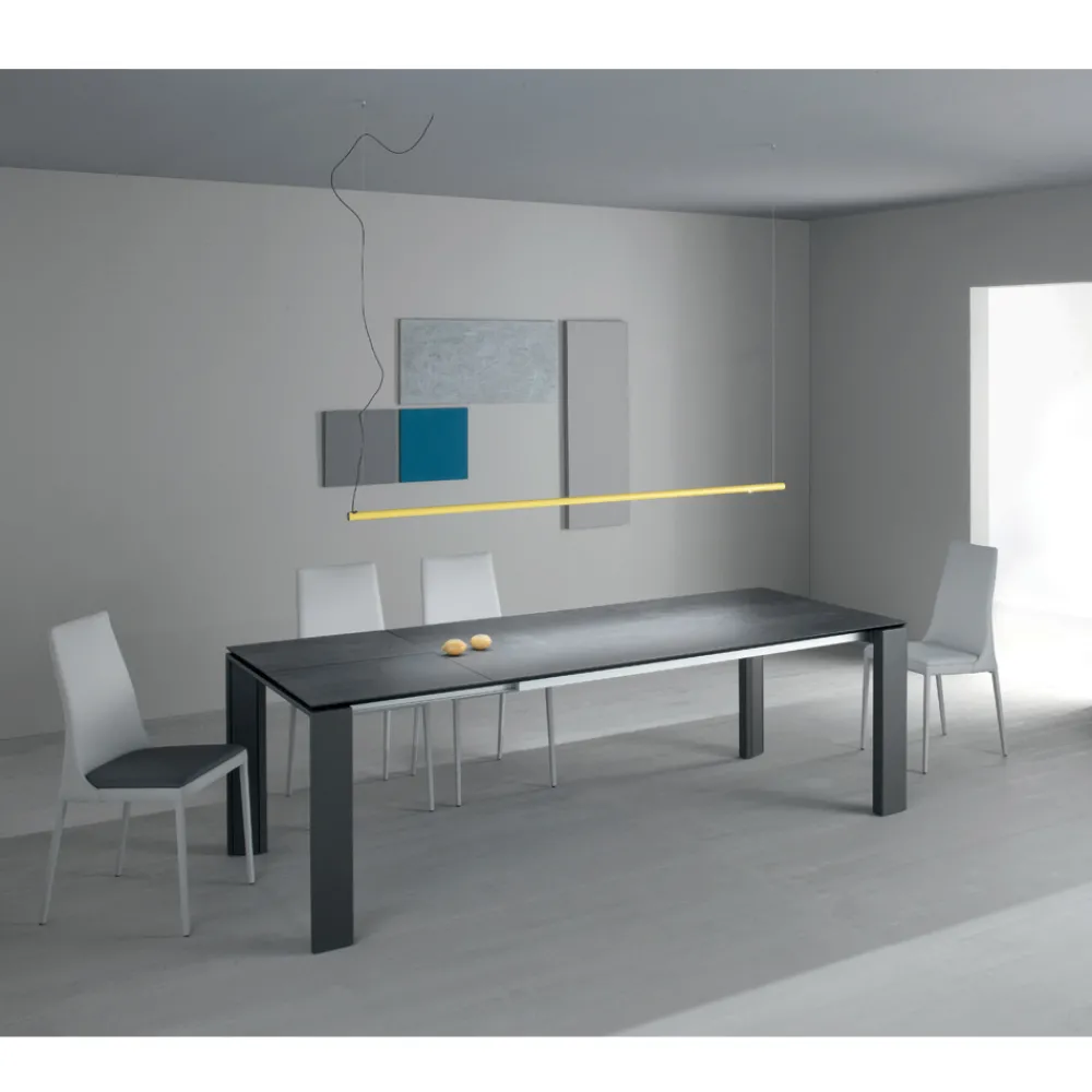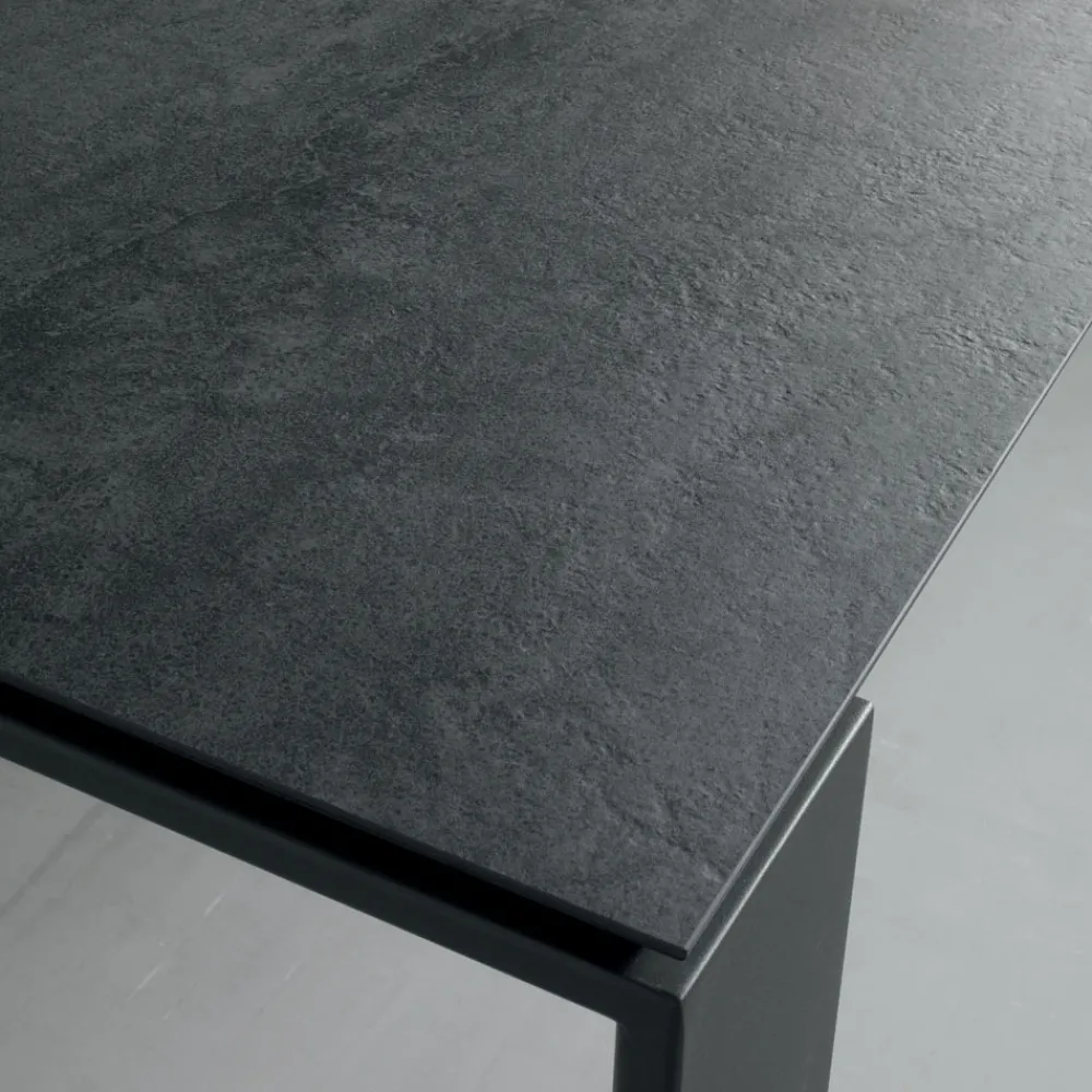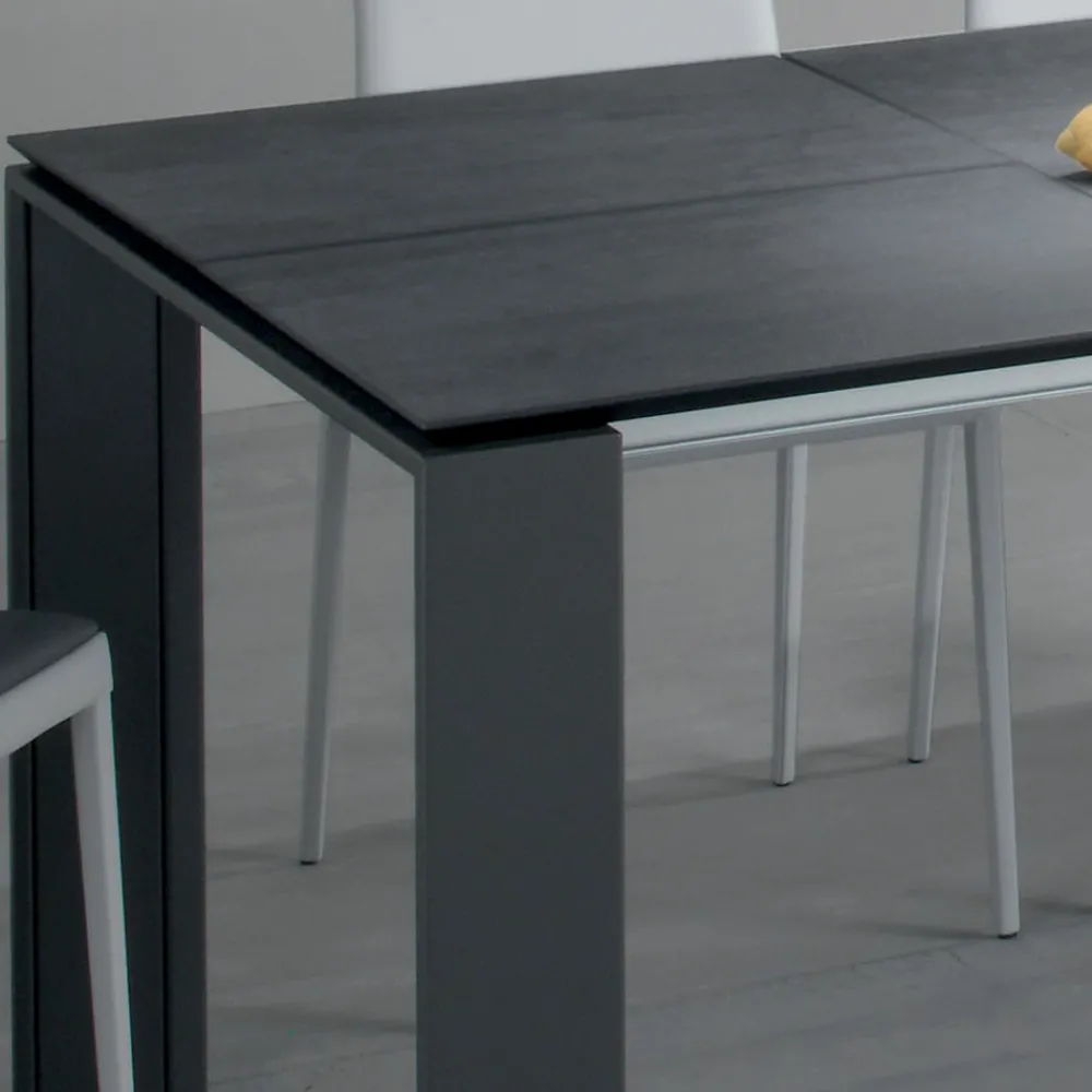 Dieser ausziehbare Esstisch hat eine Struktur mit Beinen aus geprägtem, graphitpulverbeschichtetem Metall und einer Platte mit kraftunterstützter Klappverlängerung aus undurchsichtiger Keramik auf einer Platte mit einem ausziehbaren Aluminiumrahmen.