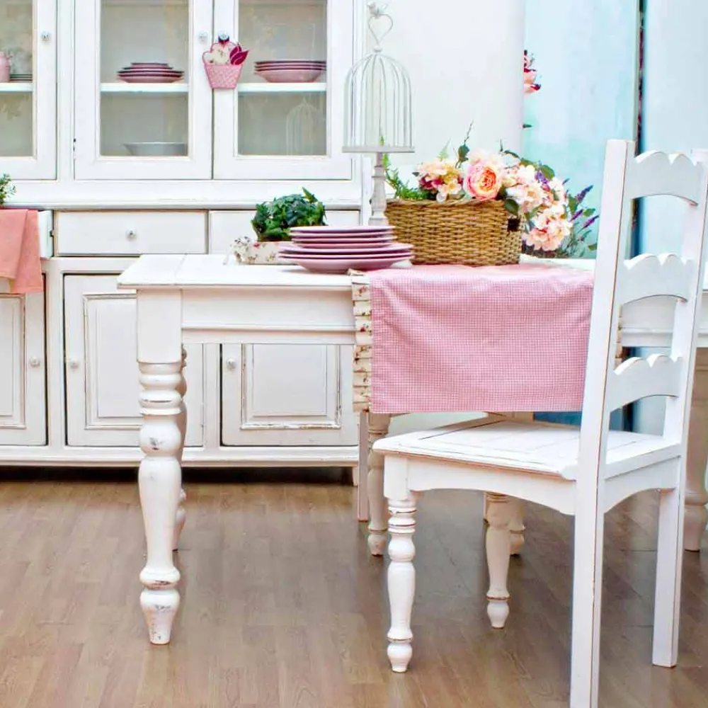 Beine und Struktur aus Mangoholz , Farbe auf Nitrocellulosebasis. Mittelplatten der Oberseite in furniertem MDF .
