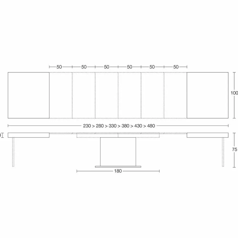 Gekennzeichnet durch eine ausziehbare Platte aus Melaminholz und einen zentralen Sockel aus Edelstahl .