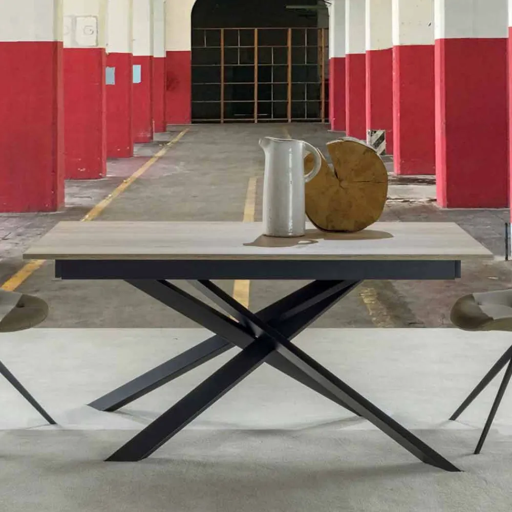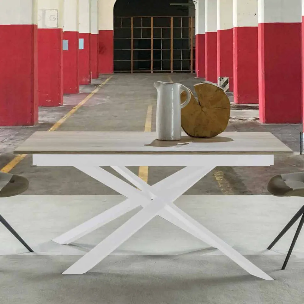 Die Beine dieses Produkts spiegeln seine Identität wider, mit dieser Verflechtung zwischen ihnen. Das verwendete Material ist lackiertes Metall, während die Platte aus 25 mm Laminat besteht.