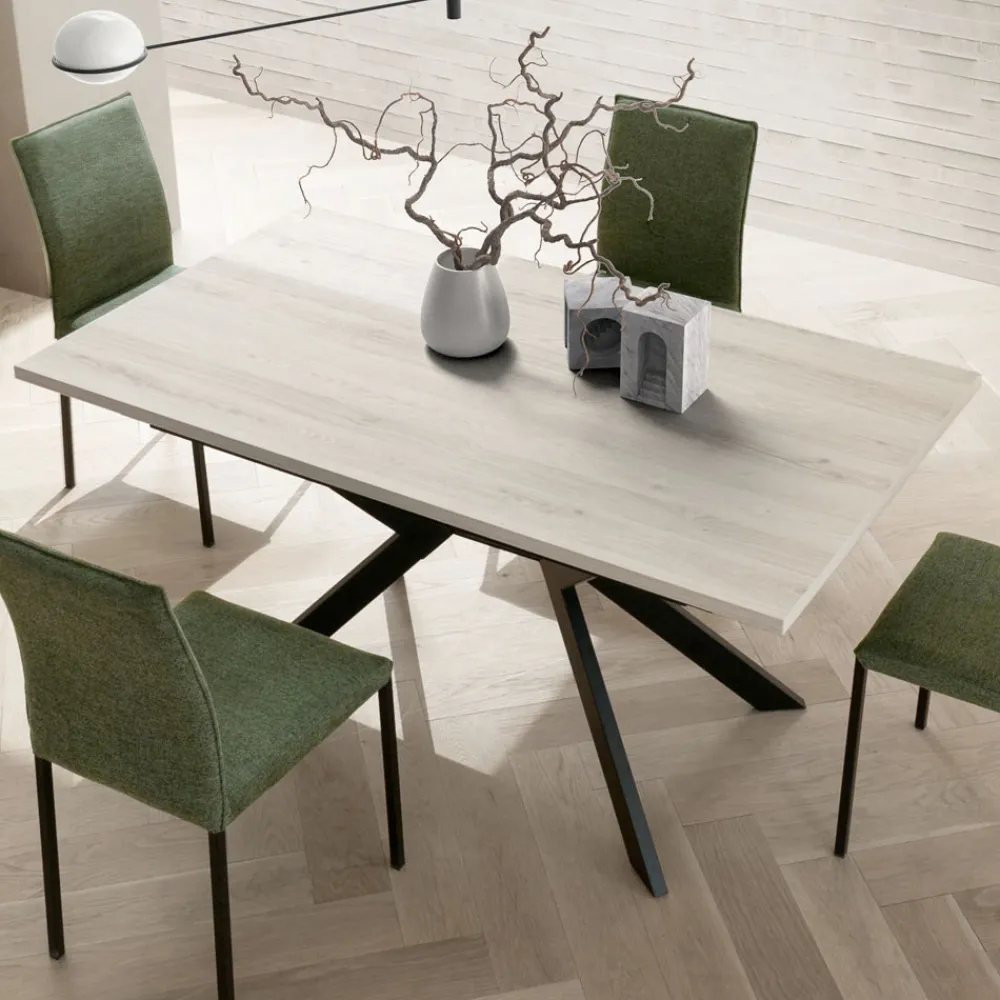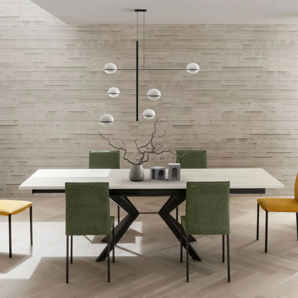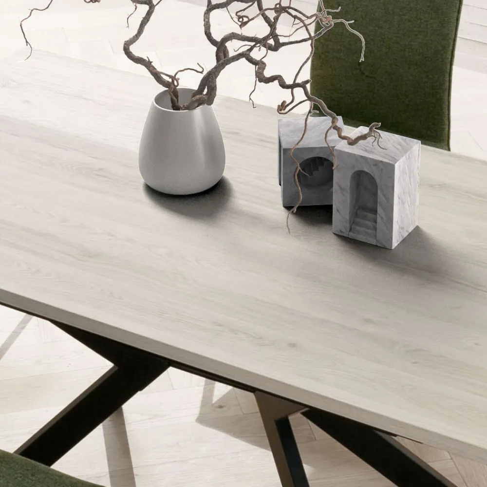 Der Sockel aus lackiertem Metall mit gekreuztem geometrischem Design bietet Stabilität und eine skulpturale Note, die nicht unbemerkt bleibt. Eine perfekte Einrichtungslösung für Esszimmer, offene Räume oder Vertragsumgebungen mit raffiniertem Stil.