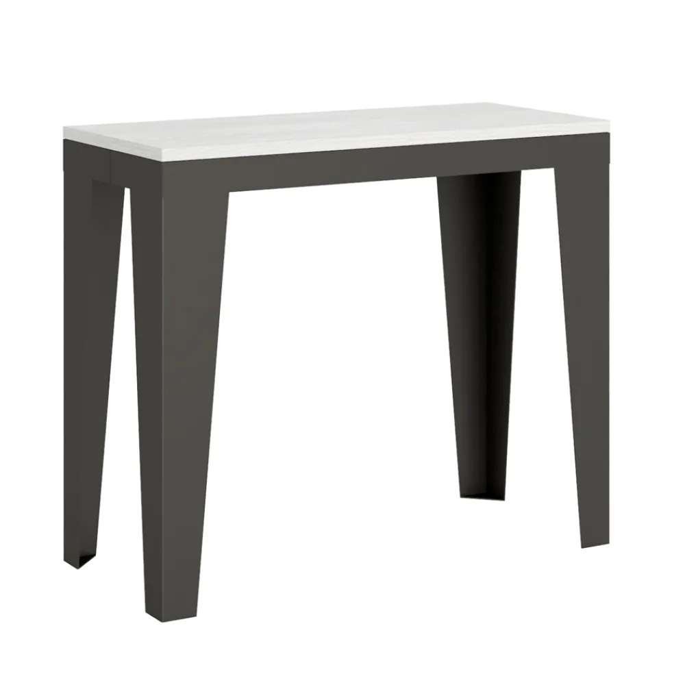 Dieser ausziehbare Konsolentisch ist die Quintessenz von Einfallsreichtum und elegantem Design. Sein durchdachter Look entsteht durch die Kombination von scharfen Linien und kontrastierenden Farben, mit schlanken Beinen aus anthrazitfarbenem Metall, die eine Holzplatte tragen und ein auffallendes optisches Gleichgewicht schaffen.