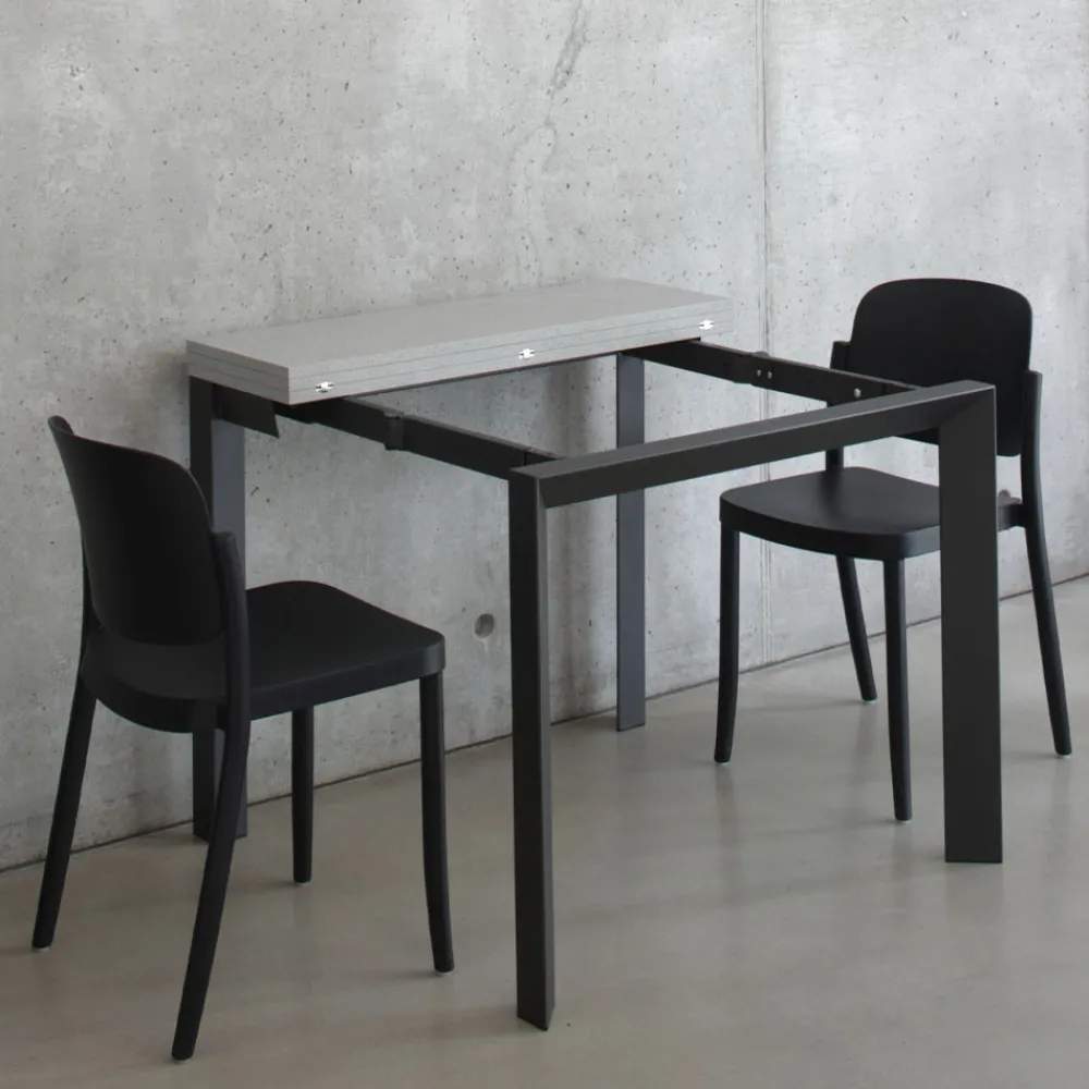 Ausziehbare Konsole mit klappbarer Oberseite aus Granit-Melamin und Sockel aus geprägtem Metall in Graphitoptik , vollständig hergestellt in Italien.