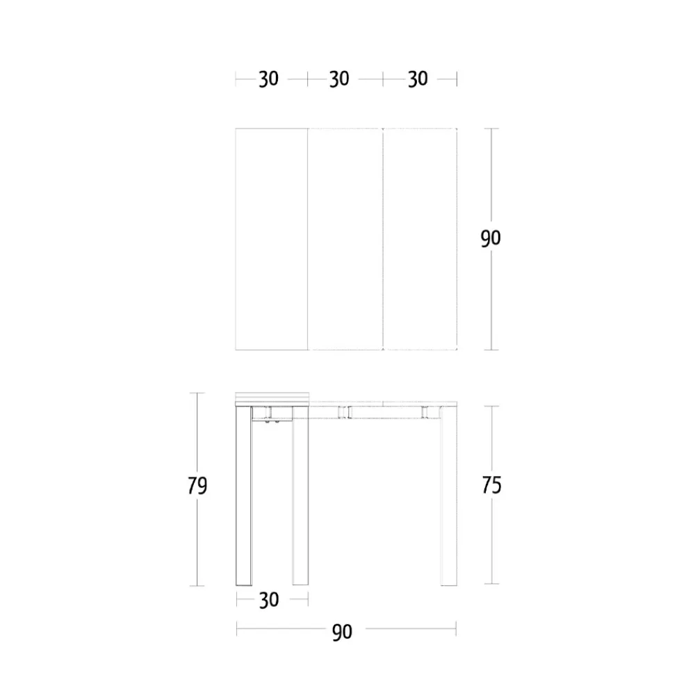 - geschlossen: Länge: 90 cm x Tiefe: 30 cm x Höhe: 79 cm