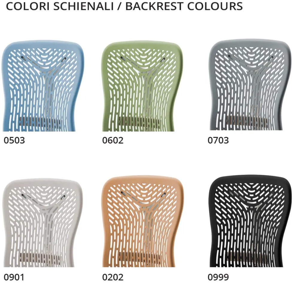 - Rückenlehne: aus sichtbarem Polypropylen. Y-förmige Stütze aus Polyamid und integrierte Lordosenstütze.