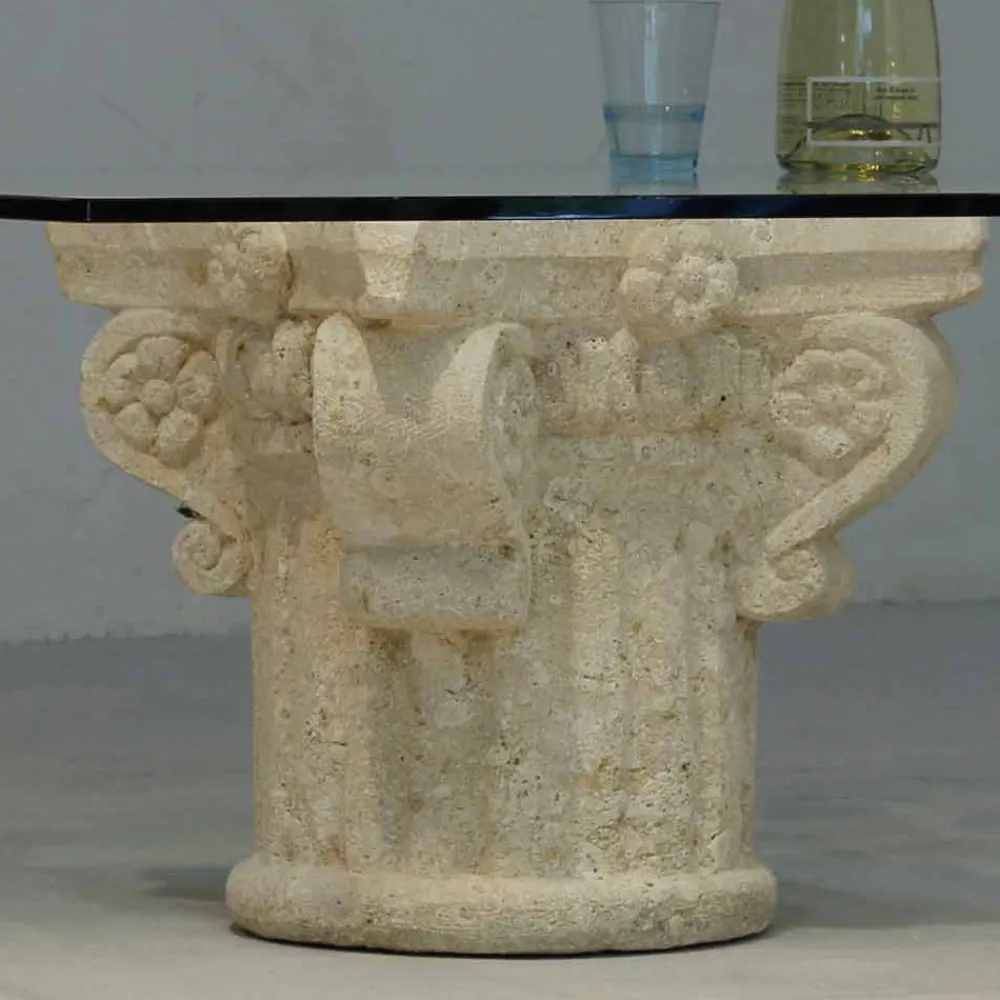 Die Basis ist aus Naturstein aus Vicenza hergestellt und wird von Hand bearbeitet. Die Tischplatte besteht aus Kristall float mit einer Dicke von 12 mm und ist an dem Stein mit einem Flansch befestigt.