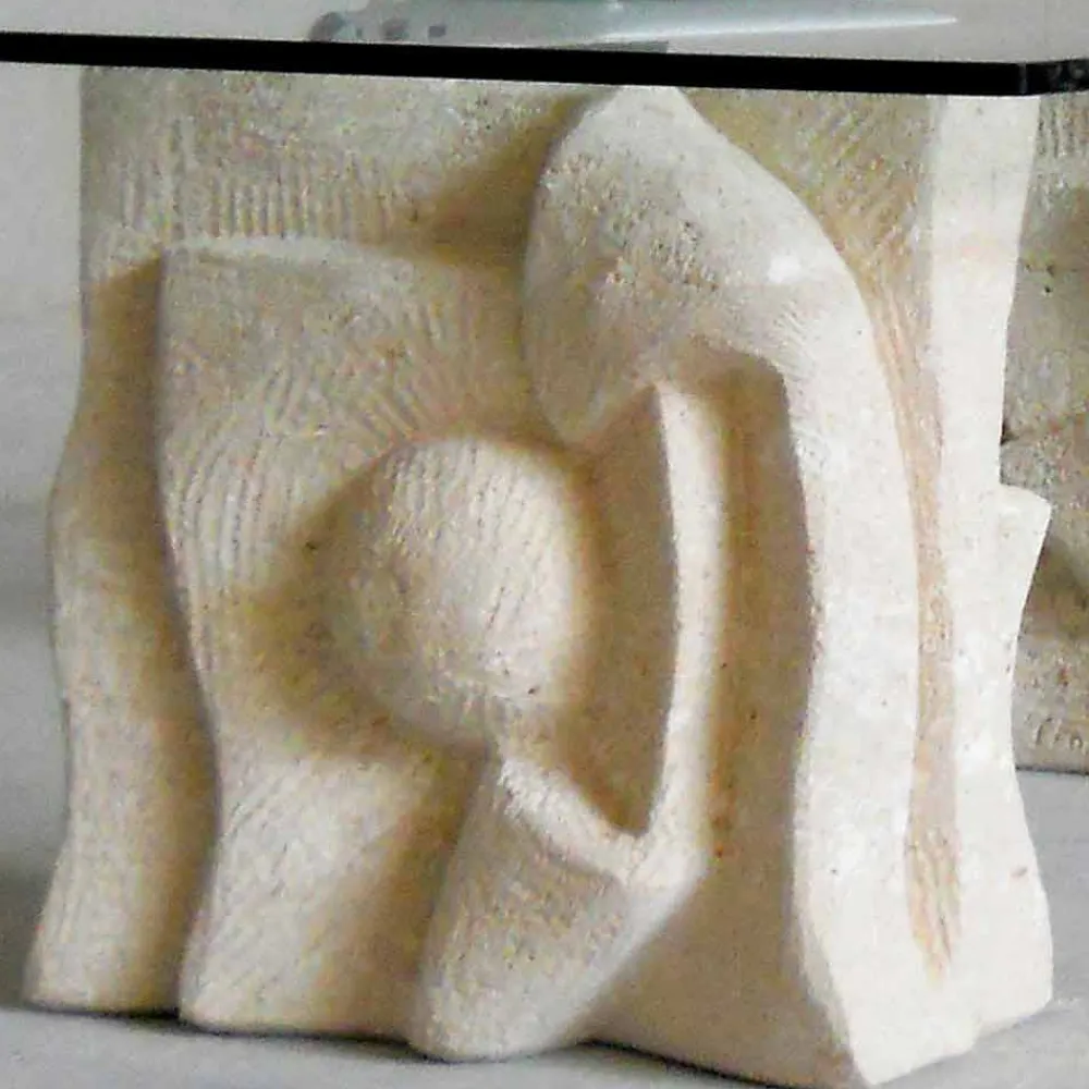 Die Basis ist aus Naturstein aus Vicenza hergestellt und wird von Hand bearbeitet. Die Tischplatte besteht aus Kristall float mit einer Dicke von 12 mm und ist an dem Stein mit einem Flansch befestigt.
