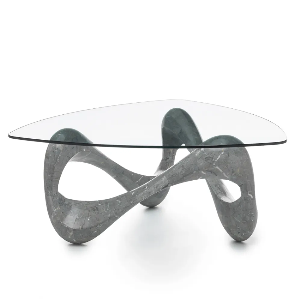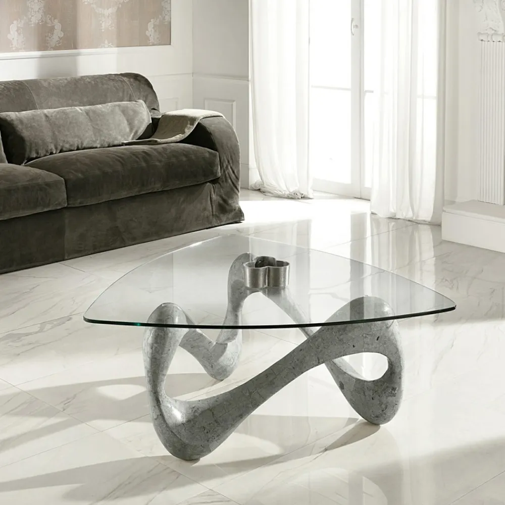 Weiche, geschwungene und unregelmäßige Linien bilden die Struktur dieses originellen Couchtisches, ergänzt durch eine widerstandsfähige, transparente, dreieckige, gehärtete Glasplatte mit polierter Kante von 10 mm.