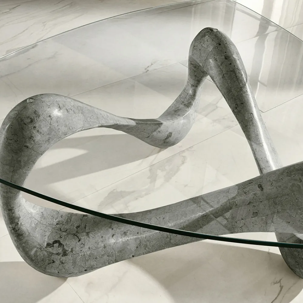 Der Couchtisch California zeigt das Können erfahrener Handwerker bei der Bearbeitung von Fossilsteinen , um ihm die unterschiedlichsten Formen zu verleihen.