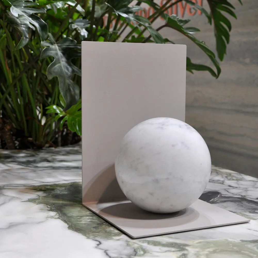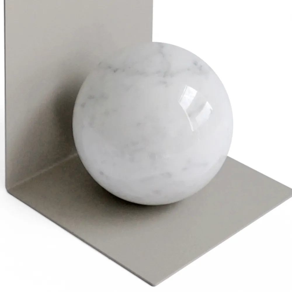Diese Buchstütze aus Marmor ist die perfekte Synthese aus Funktionalität und moderner Skulptur . Das Design ist kühn minimalistisch, wobei eine Marmorkugel auf eine Metallplatte trifft und so ein optischer Kontrast entsteht, der eine wahre Augenweide ist.