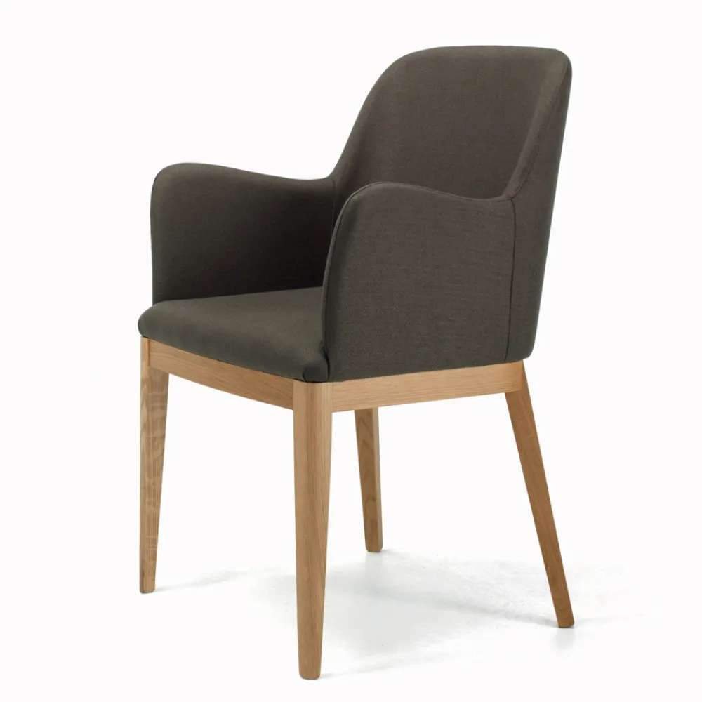 Wohnzimmerstuhl mit gepolsterter und gepolsterter Sitzfläche und Rückenlehne sowie Beinen aus Eichenholz .