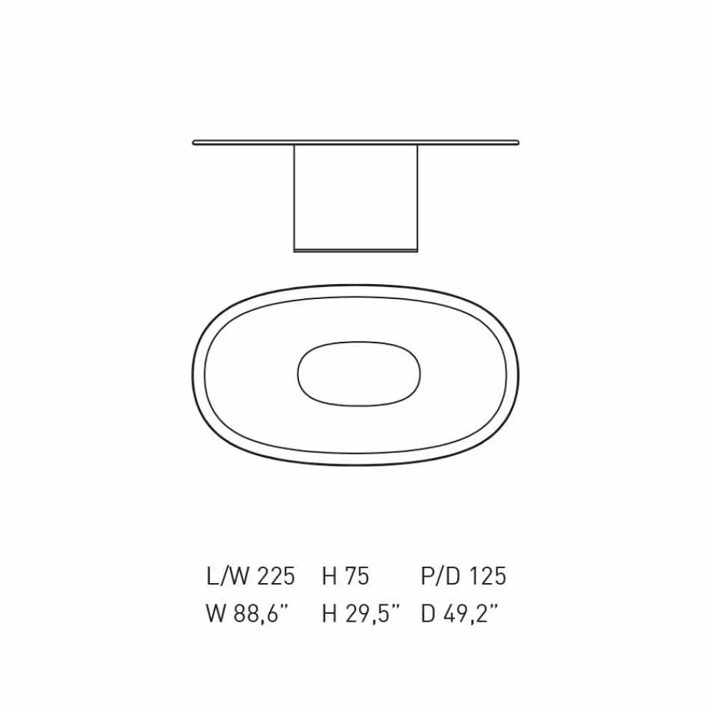 Das einbeinige Design und die ovale Platte aus lackiertem MDF werden von Profilen in verschiedenen Ausführungen begleitet, die ihm einen luxuriösen und keineswegs banalen Charakter verleihen.