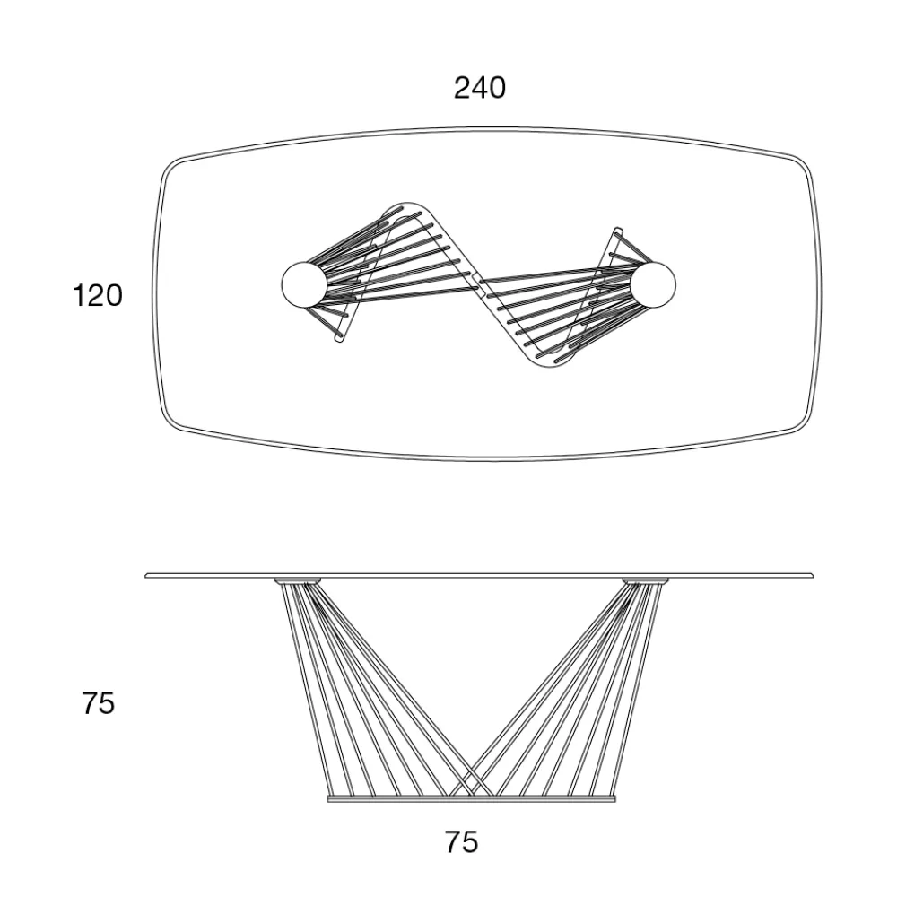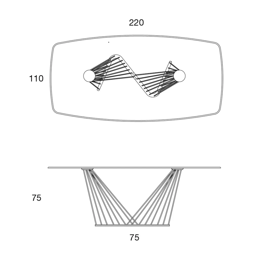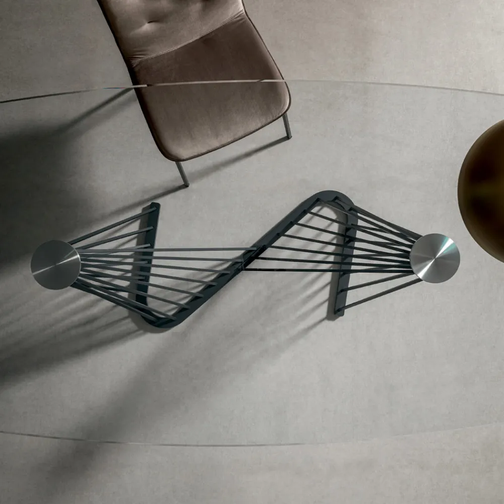 Seine Besonderheit wird durch die Struktur gegeben, die aus einer Reihe von Metallschnüren von ungleicher Länge besteht und gespannt ist, um die Glasplatte zu tragen.