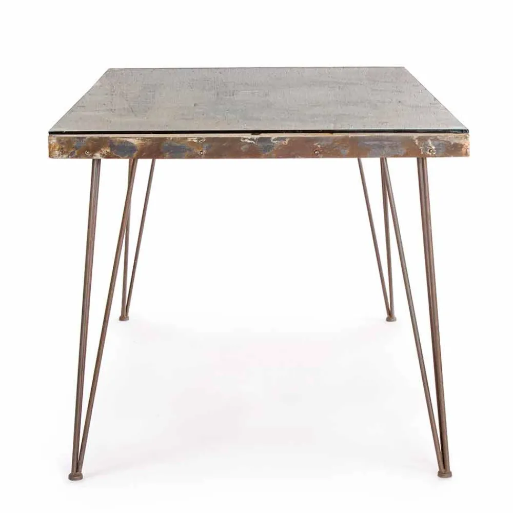 Esstisch im Industriestil mit MDF- und Glasplatte und Stahlfuß.