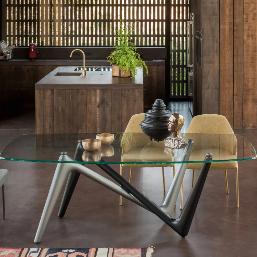 Der Tisch in fester Ausführung ist eine vielseitige Lösung für verschiedene Einrichtungsstile. Die Glasplatte in Kombination mit dem lackierten Sockel trägt dazu bei, den Charakter des Hauses zu definieren. Erhältlich in zwei verschiedenen Plattengrößen, um den Platzbedarf besser zu erfüllen. Die Tischstruktur umfasst Beine aus lackiertem Hartpolyurethan, und die tonnenförmige Platte besteht aus extraklarem, transparentem Hartglas mit abgeschrägter Kante und bietet die Wahl zwischen einem modernen und eleganten Look oder einem traditionelleren und robusteren Look.