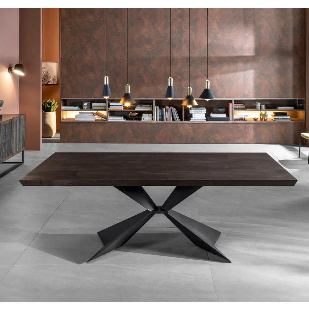 Dank der Form seiner Beine verleiht dieser Tisch dem Raum eine moderne und elegante Note, die perfekt zum klassischen Holzbezug passt und so den unterschiedlichen Stil- und Designbedürfnissen gerecht wird. Es ist ein Tisch, der zum Protagonisten des Wohnbereichs wird, sei es in der Küche oder im Wohnzimmer, und dem Kunden einzigartige und unvergessliche Momente der Geselligkeit beschert.