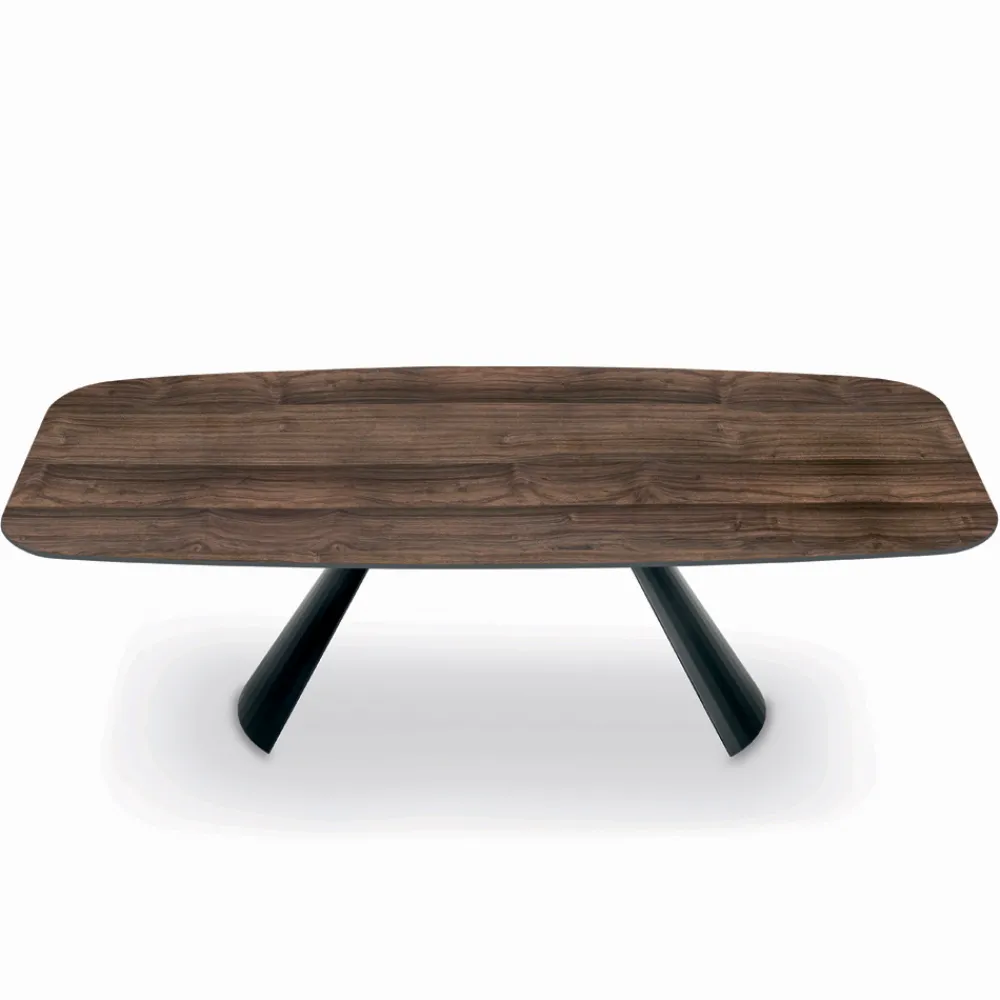 Fester, tonnenförmiger Wohnzimmertisch mit Laminatplatte , 30° abgeschrägter Kante , schwarz lackiertem Stahlgestell und verstellbaren Füßen.