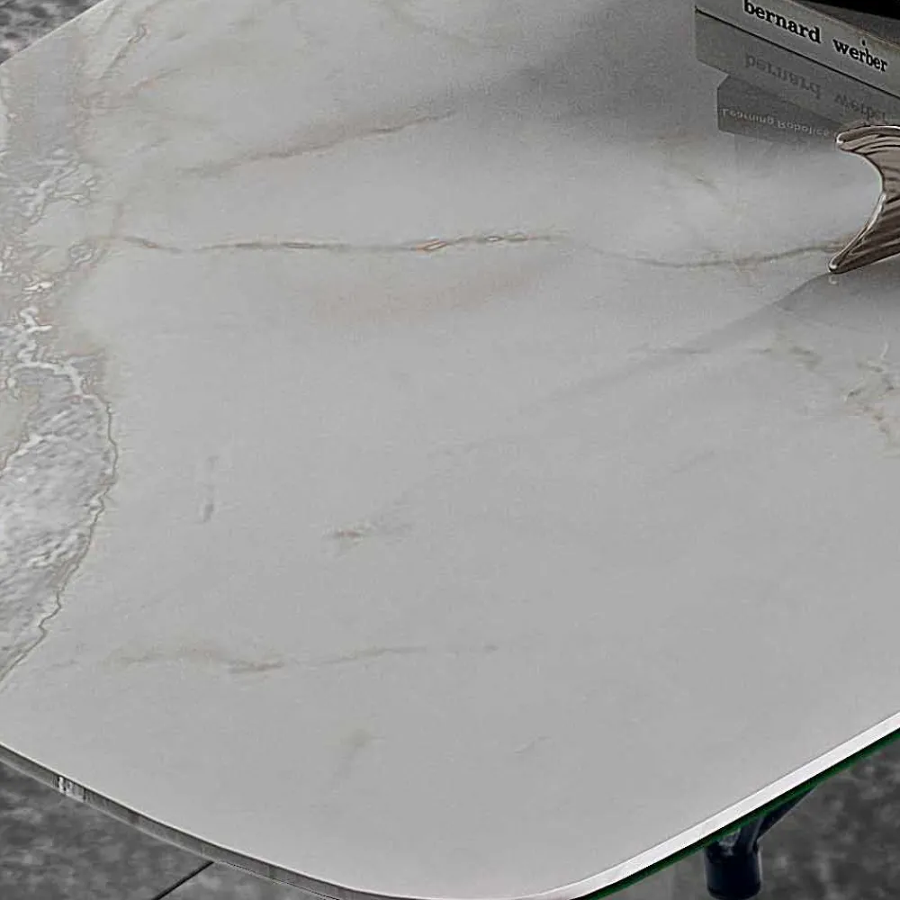 Moderner und raffinierter Esstisch, handgefertigt in Italien mit tonnenförmiger Oberseite aus Laminam-Keramik, hergestellt aus einer abgeschrägten Glasplatte und einer aus Keramik, und Sockel aus schwarz lackiertem Stahl . Aus der perfekten Kombination von Funktionalität und Design entsteht ein Einrichtungsaccessoire mit einer raffinierten Seele, das Esszimmer oder Küchen auf exklusive Weise mit einem modernen Stil vervollständigt und ihm einen revolutionären Touch verleiht. Die Ästhetik des Tisches wird auch durch die besondere Form des Untergestells bereichert, die dem Erscheinungsbild des Produkts ein originelles Detail verleiht und einer exklusiven Einrichtungslösung mit einer starken zeitgenössischen Persönlichkeit Leben einhaucht. Die funktionale Seite wird jedoch durch die wunderschöne Laminam-Keramikplatte noch verstärkt Dies macht den Tisch nicht nur einzigartig, sondern bietet auch eine unvergleichliche Qualität und ist daher ideal, um eine solide und gleichzeitig einzigartige und edle Tischplatte zu garantieren.