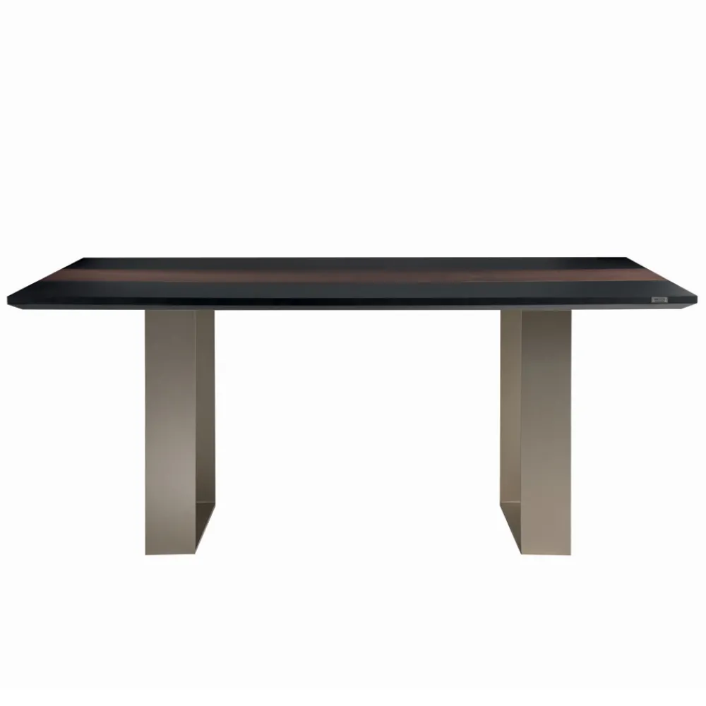 In Italien hergestellter Esstisch bestehend aus zwei Eisenbeinen mit Nickel-Finish und einer rechteckigen Platte aus MDF mit Anthrazit-Finish mit oberem Einsatz aus Massivholz mit gebeizter Esche. Eine Ergänzung mit einem minimalen, aber unglaublich modernen Stil, der entworfen wurde, um jeden Wohnraum auf essentielle Weise einzurichten. Seine Ästhetik ist besonders einfach, gekennzeichnet durch minimale Formen, eine rechteckige Platte, die auf zwei Beinen mit einer besonderen Verarbeitung ruht, die einen dynamischen und eleganten visuellen Effekt vermitteln.