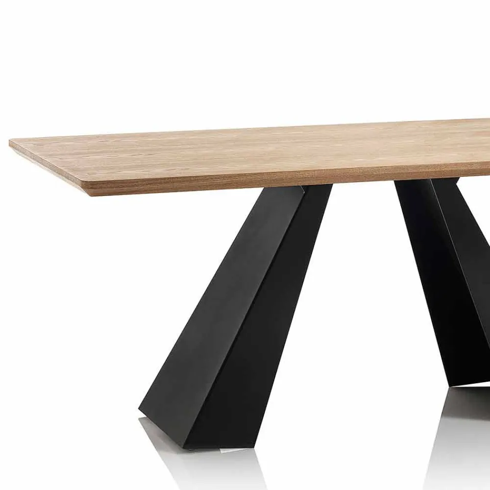 Rechteckiger Esstisch in modernem Design mit eichenfarbener MDF- Platte und mattschwarz lackierten Metallbeinen . Die Kombination von Materialien und Oberflächen ermöglicht die Positionierung des Tisches in den unterschiedlichsten Einrichtungsstilen und verleiht jedem Raum auf jeden Fall einen Hauch von Eleganz und Persönlichkeit.
