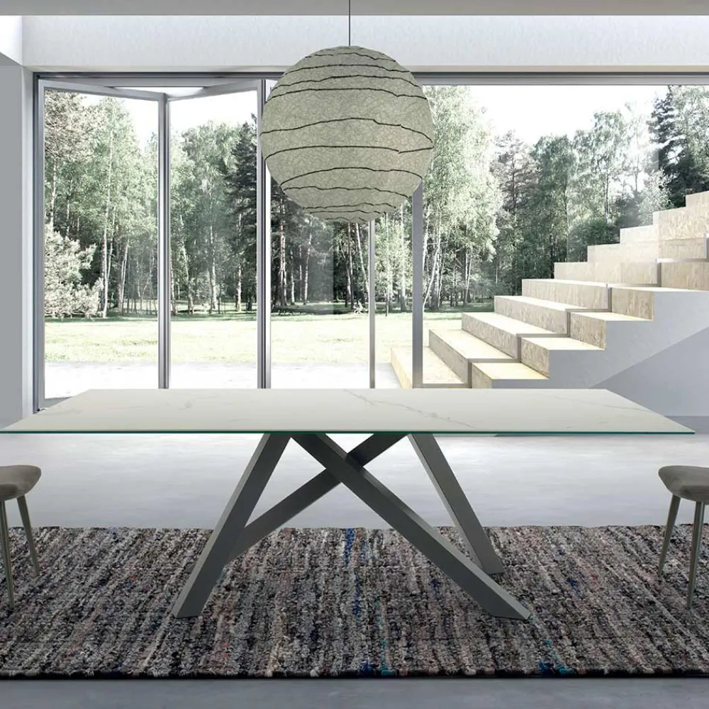 Tisch mit Keramikplatte und taubengrauem Stahlgestell in modernem Design, hergestellt in Italien.