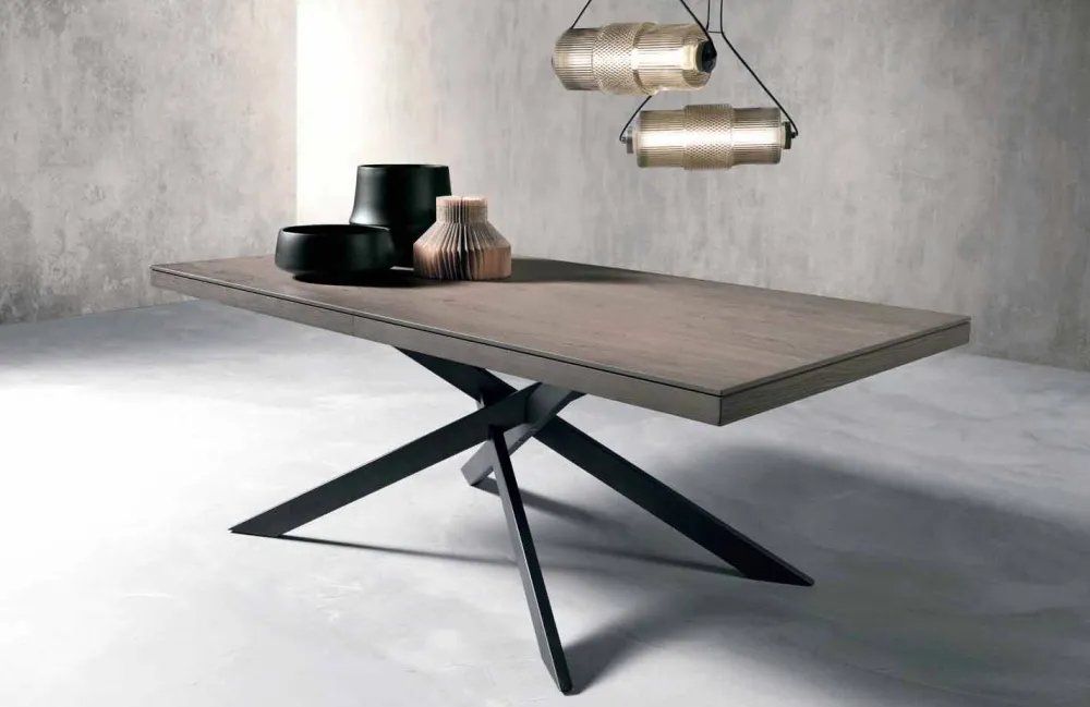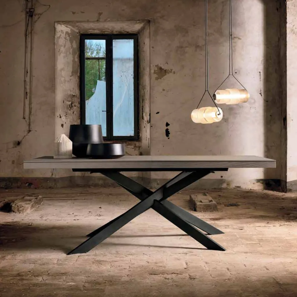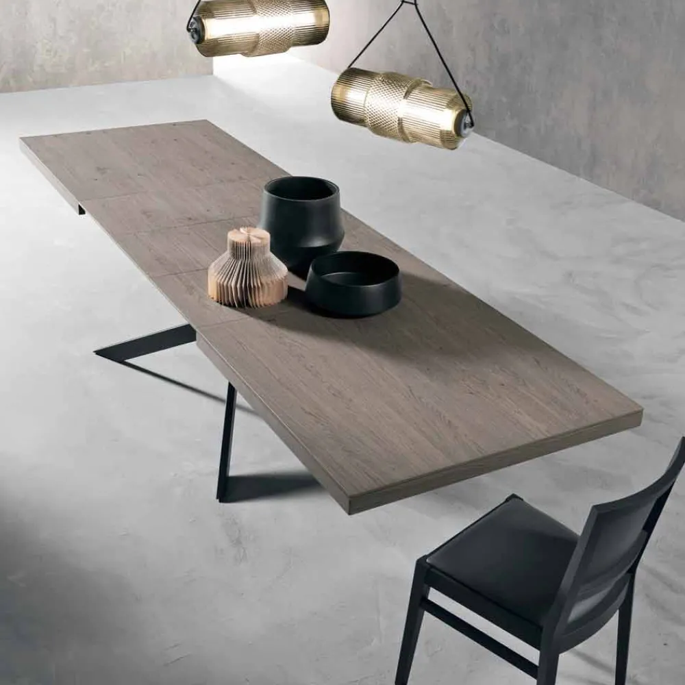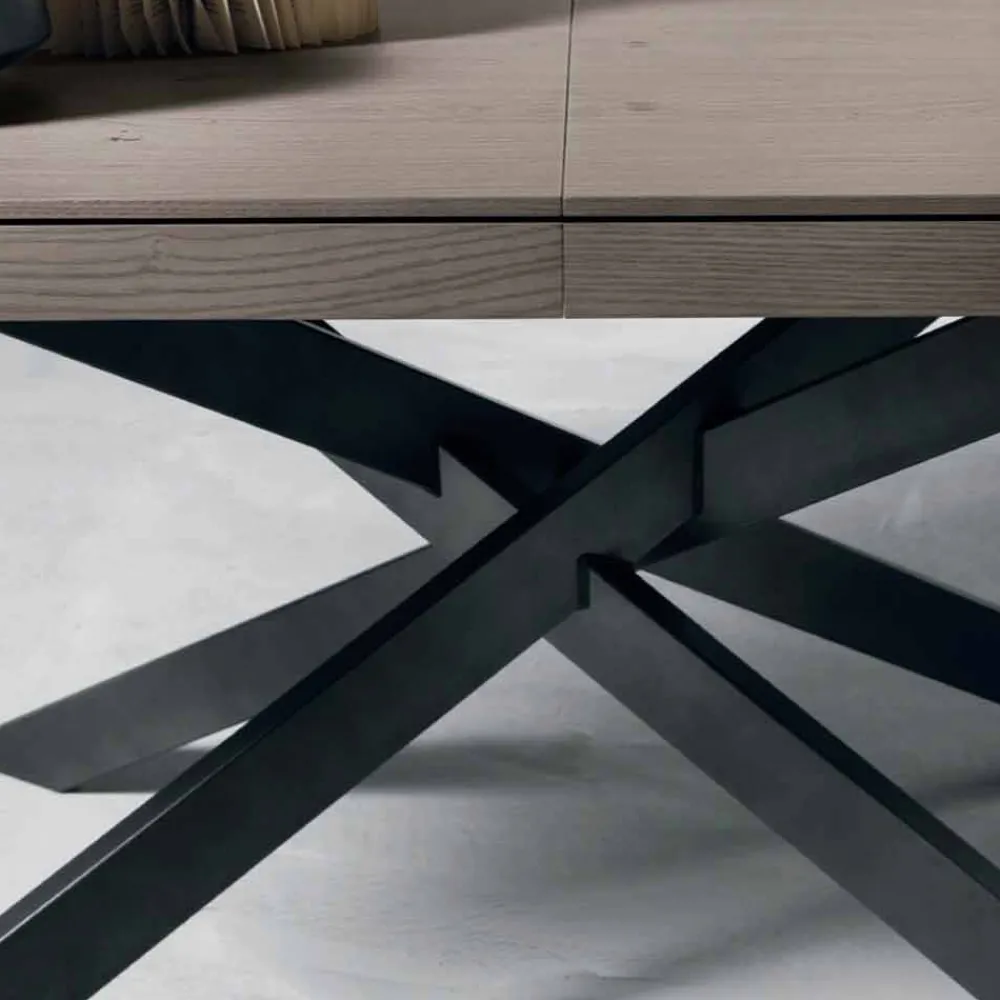 Die Platte hat eine Stärke von 18+42 mm und besteht aus geknotetem Eichenfurnier; aus der zentralen Gleitschiene lassen sich die 3 im Rahmen enthaltenen Verlängerungen von jeweils 45 cm herausziehen.