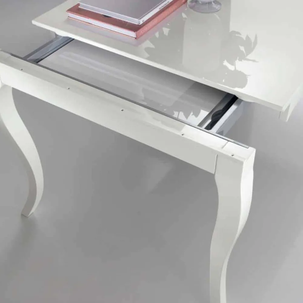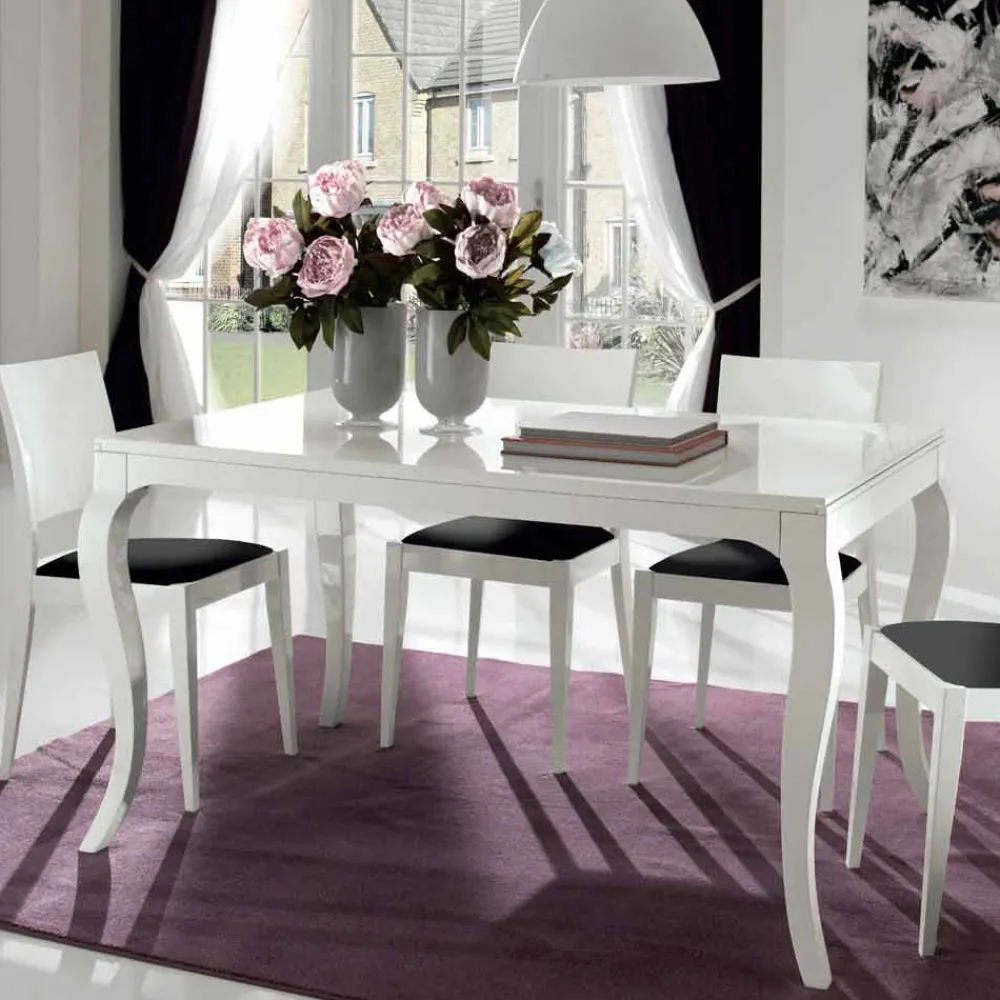 Ausziehbarer Esstisch bis 350 cm mit glänzend weißer Holzplatte aus Tanganyika-Walnussfurnier und Untergestell aus massivem Buchenholz, hergestellt in Italien.