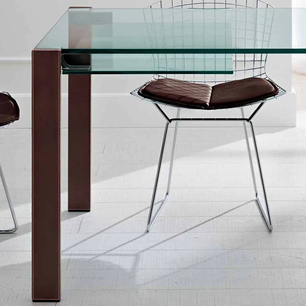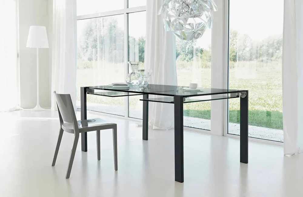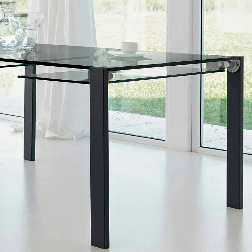 Transparenter Glastisch ausziehbar bis zu 12 Stellen mit Metall- oder Canaletto-Walnuss-Basis, hergestellt in Italien.