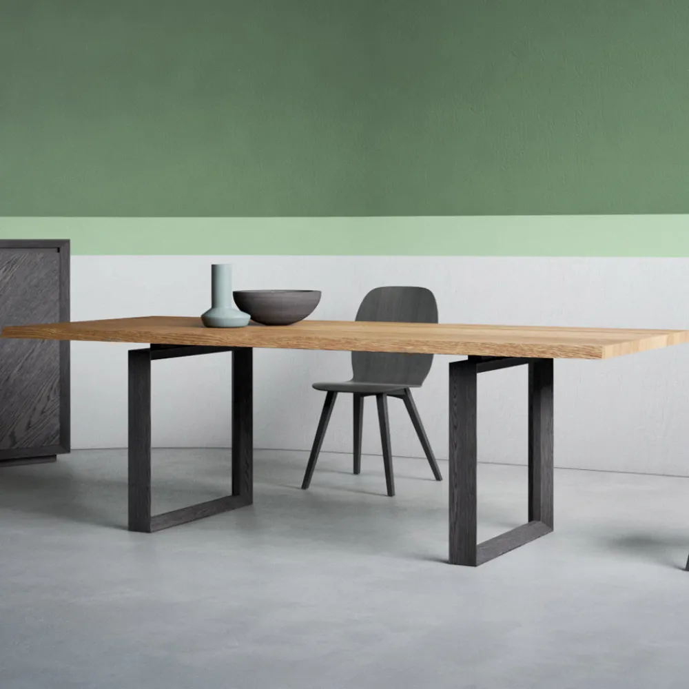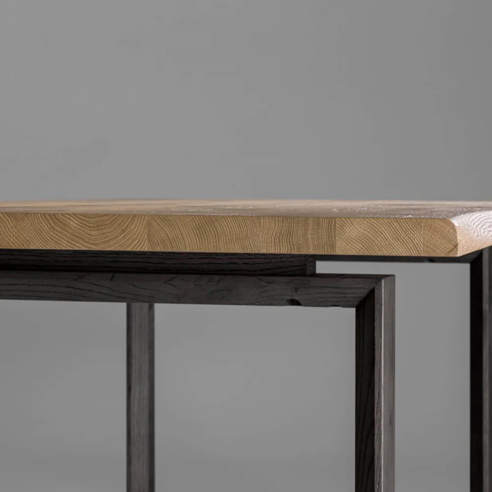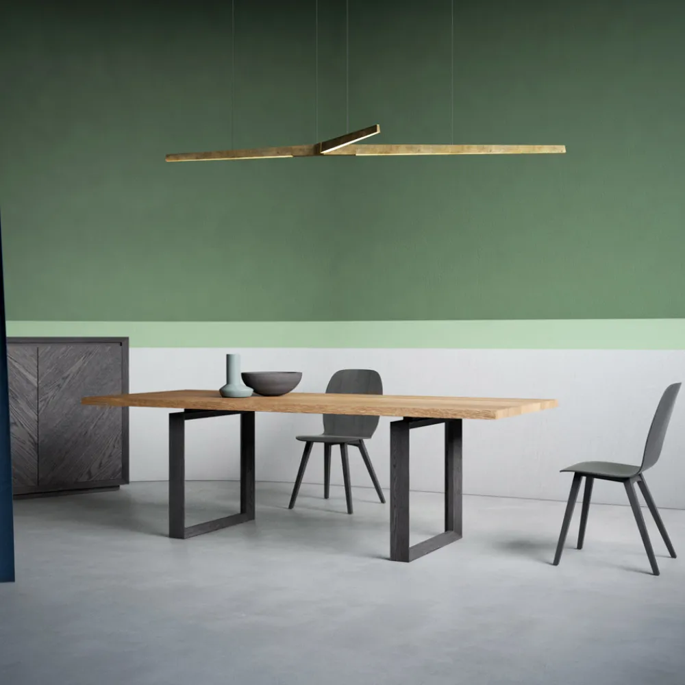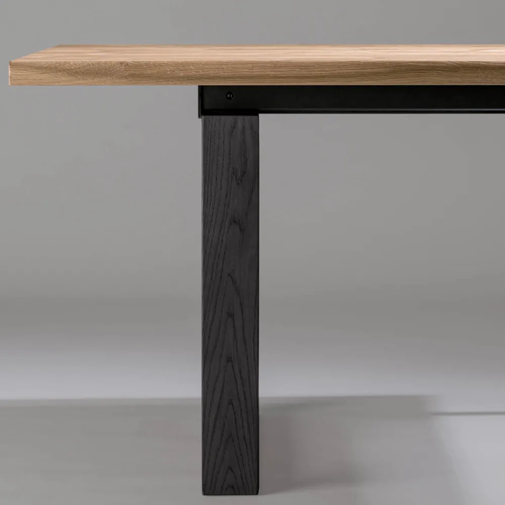 Ausziehbarer Tisch mit abgeschrägter Platte aus natürlichem Eichenfurnier auf Pappelspanplatte und entrindeter Kante. Beine aus furniertem und abgeschrägtem Massivholz, lackiert in Räuchereiche. Im Lieferumfang sind 2 Verlängerungen von jeweils 50 cm enthalten, eine unter dem Tisch und die andere außen.