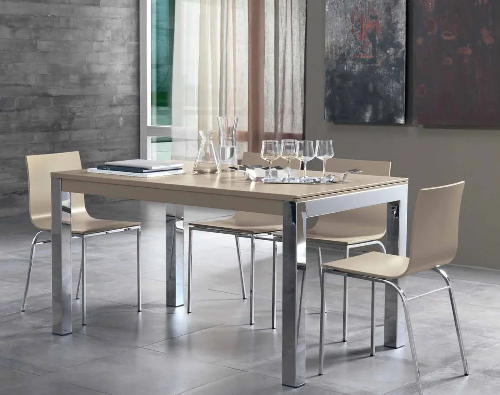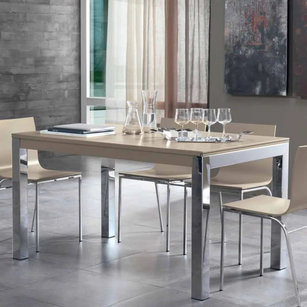Designer-Küchentisch, ausziehbar bis 350 cm, mit Tischplatte aus Tanganika-Walnussfurnierholz und verchromten Metallbeinen, hergestellt in Italien.