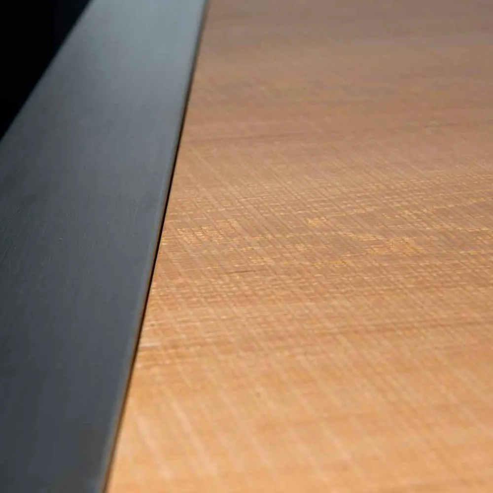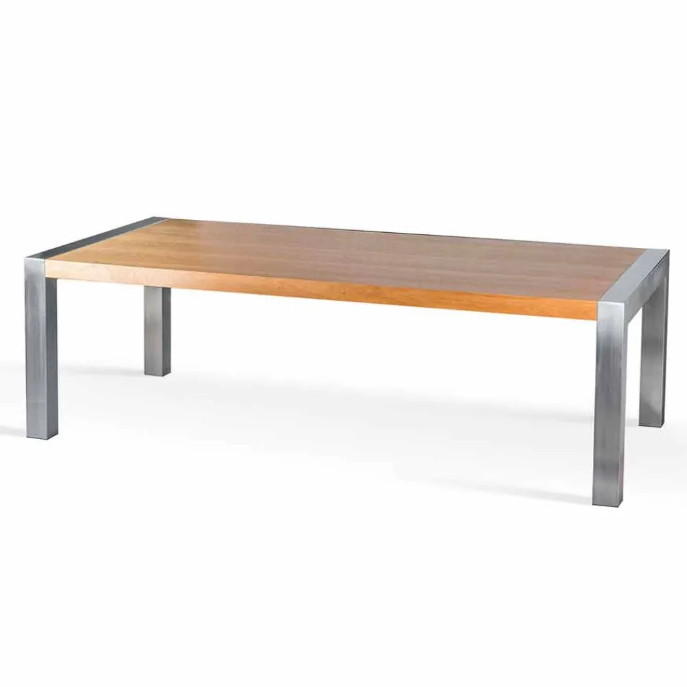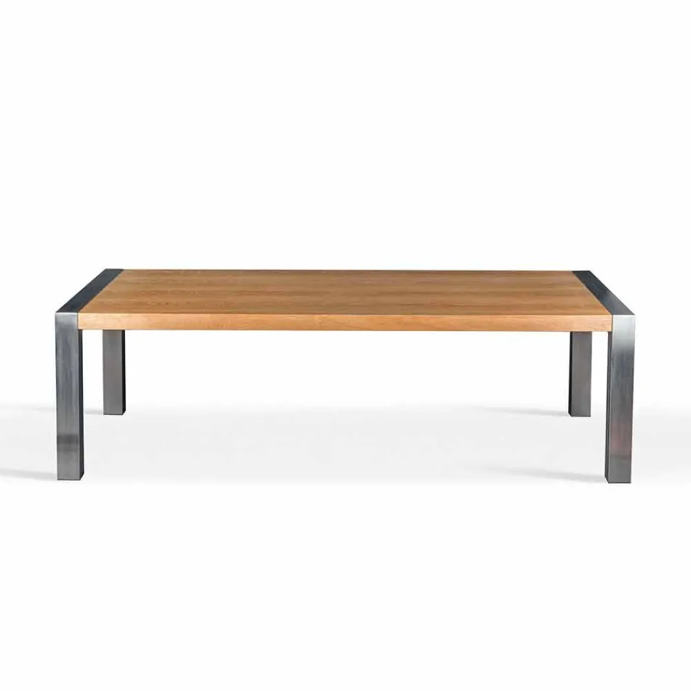 Rechteckiger Esstisch mit Tischplatte aus gebürsteter Eiche und Beinen aus Stahl.