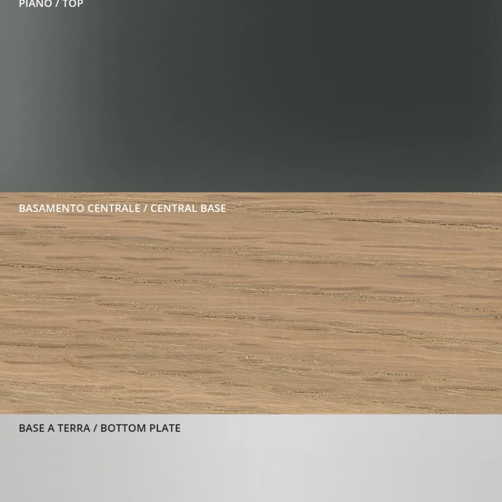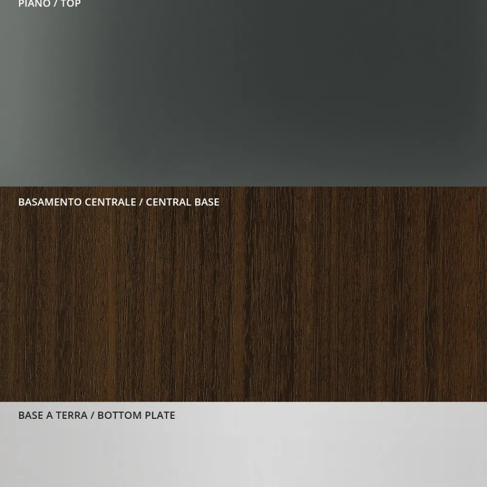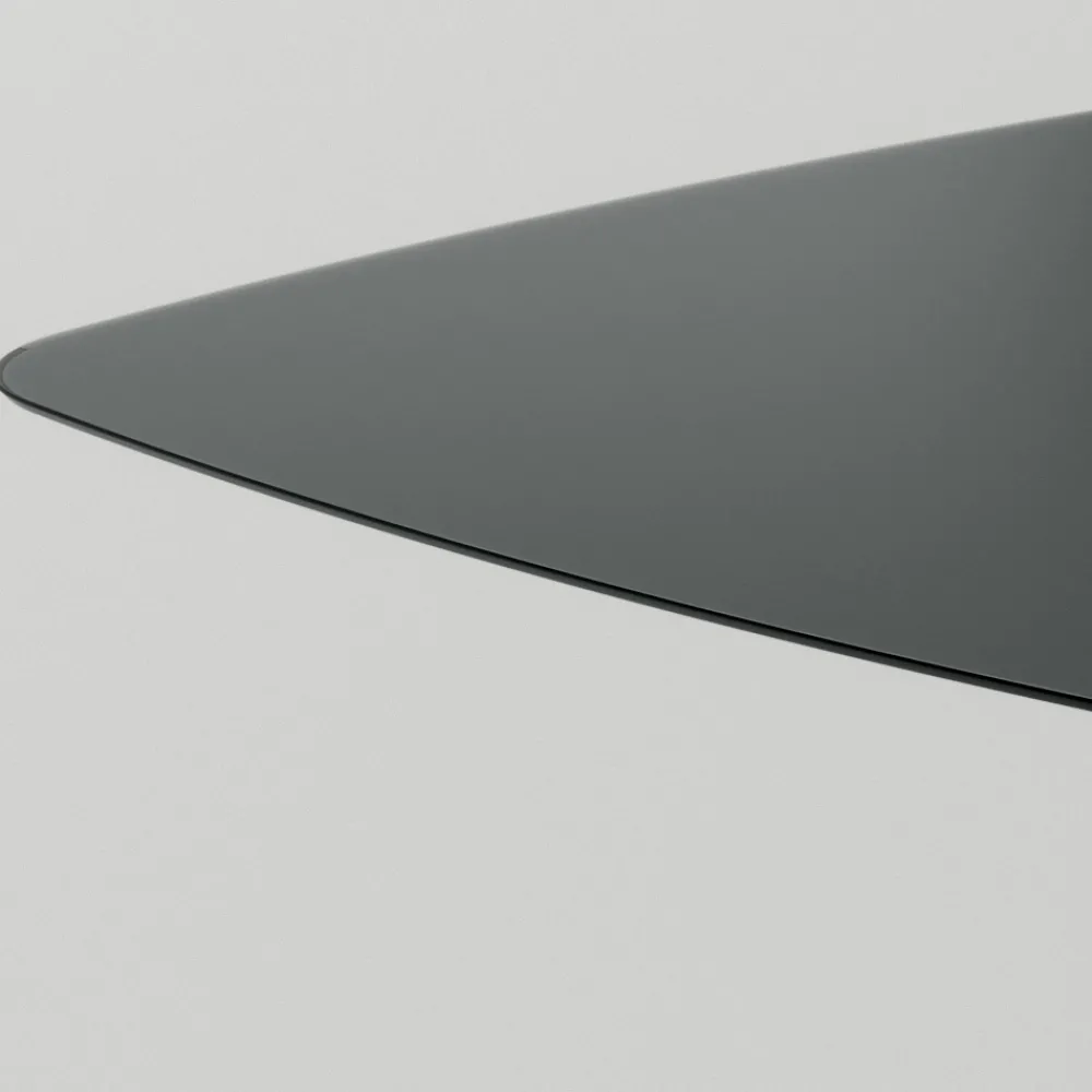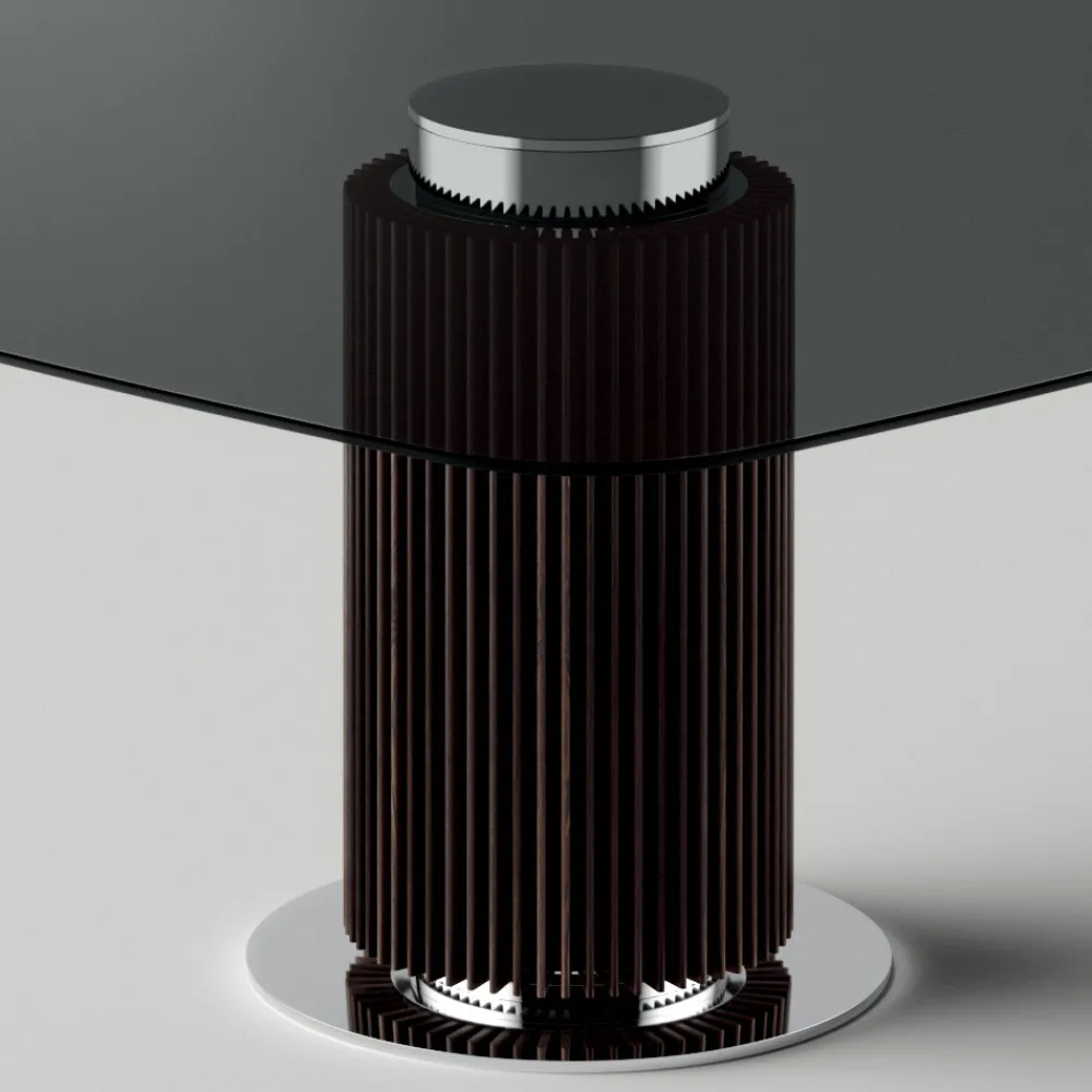 Esstisch mit quadratischer Platte aus Rauchglas und Untergestell aus Holz- und Metalllatten . Die Stärke seiner Ästhetik ist der architektonische Sockel, der durch Lamellen gekennzeichnet ist, die auf einem Metallsockel mit glänzender Chromoberfläche ruhen. Die Platte mit ihrer abgerundeten Kante verleiht den Formen Weichheit, während die Metallelemente das Design des Tisches vervollständigen und ihn mit Persönlichkeit und Robustheit bereichern.