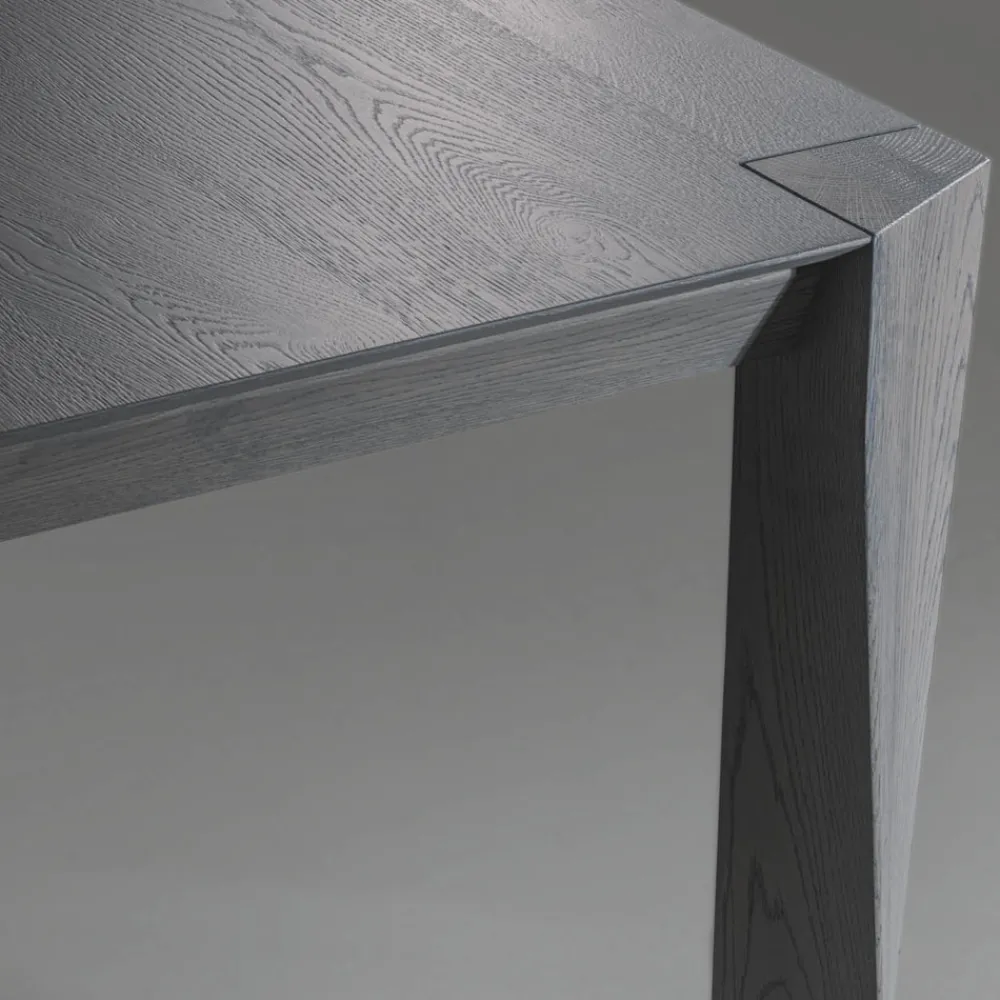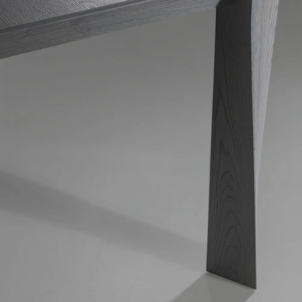 Fester Tisch mit abgeschrägter Tischplatte aus grauem Eichenfurnier und spiralförmigen Lamellenbeinen . Maße H 77 cm, Dicke 2 cm.