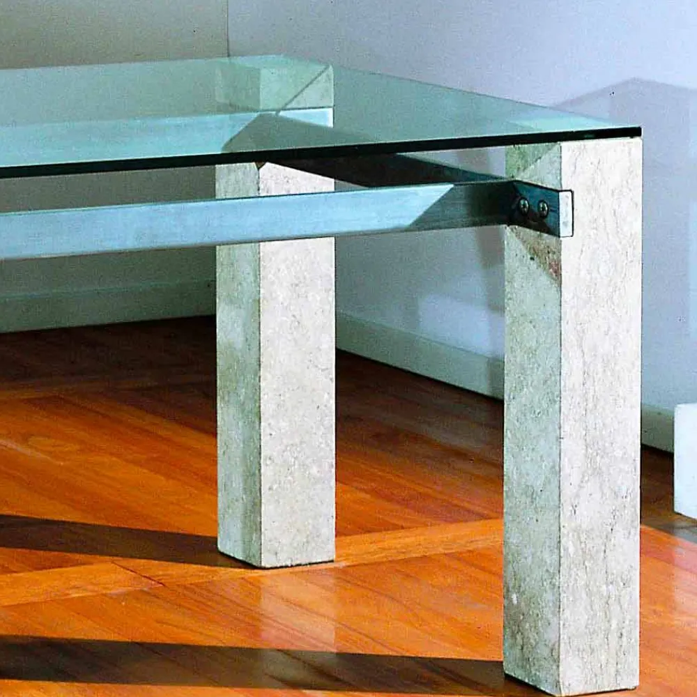 Die Basis ist aus Naturstein aus Vicenza hergestellt und wird von Hand bearbeitet. Die Tischplatte besteht aus Kristall float mit einer Dicke von 15 mm und ist an dem Stein mit einem Flansch befestigt.