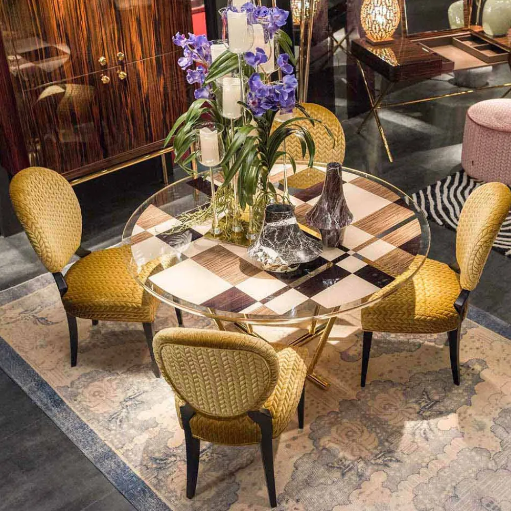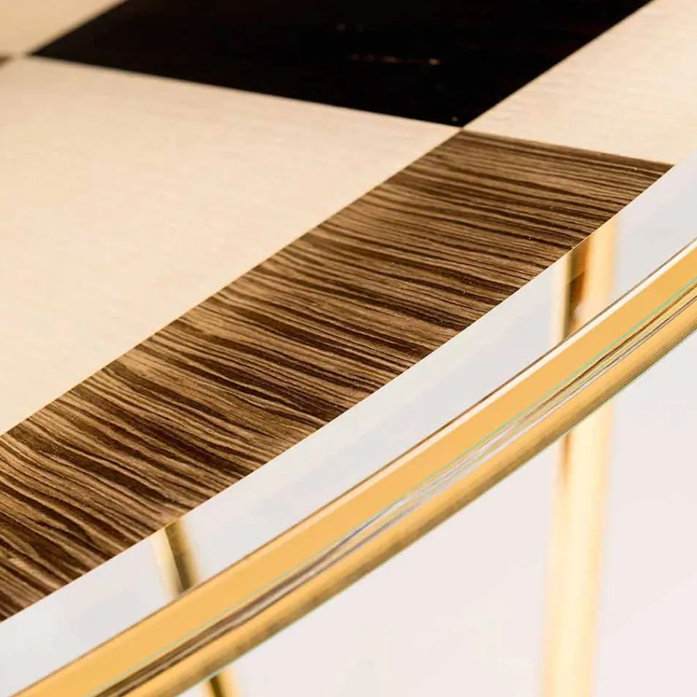 Erhältlich mit einer gekoppelten Glasplatte, die Intarsien aus drei Holzarten enthält (sehr helle Eiche und zwei Newood vorkomponiert in Ebenholz).